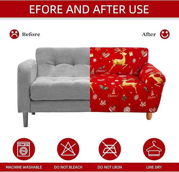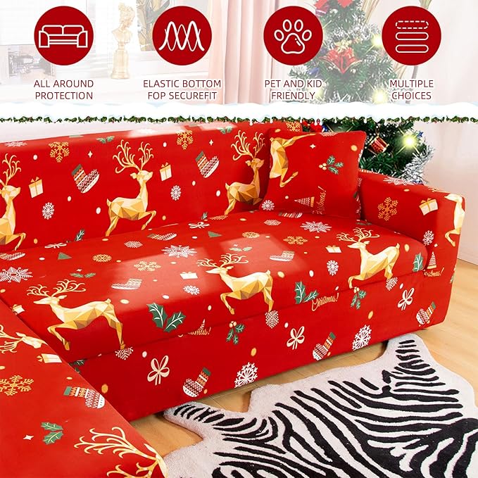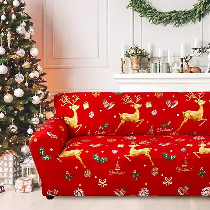Mybedsoul Christmas Printed Red Sofa Cover Reindeer Printed Elastic Couch Cover Machine Washable Christmas Theme Red Sofa Slipcover for Living Room(3 Seater/Loveseat)