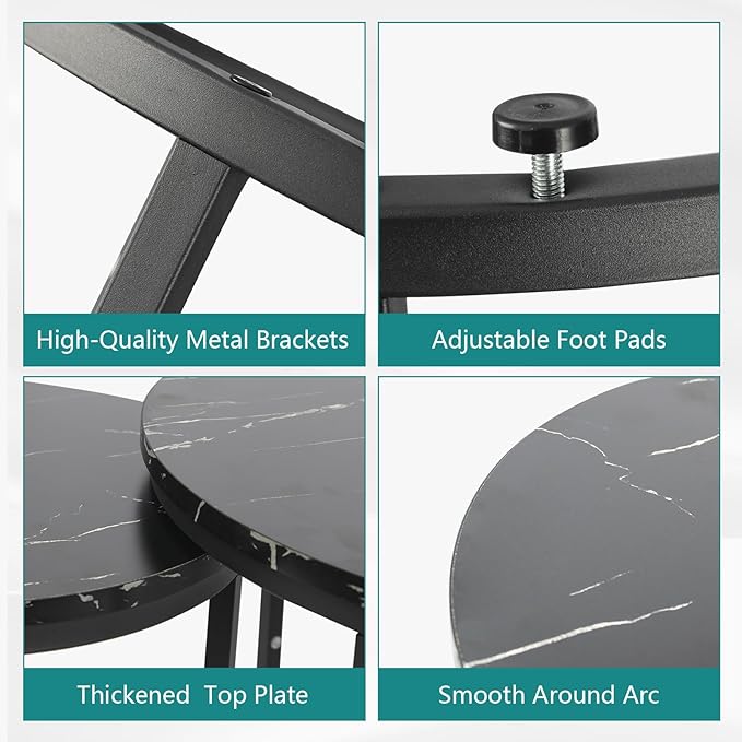Black Nesting Coffee Table Set of 2, 23.6" Round Coffee Table Wood Grain Top with Adjustable Non-Slip Feet, Industrial End Table Side Tables for Living Room Bedroom Balcony Yard
