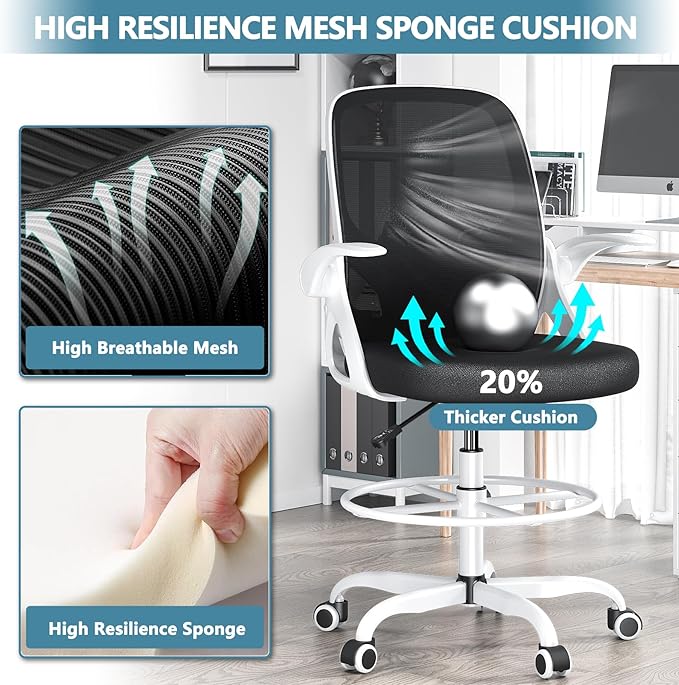 Drafting Chair Tall Office Chair for Standing Desk Adjustable Tall Desk Chair with Footrest Ring and Lumbar Support Ergonomic Computer Chair with Flip-up Armrests (White)