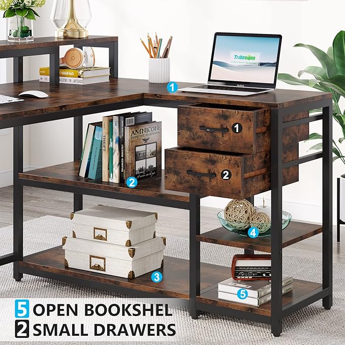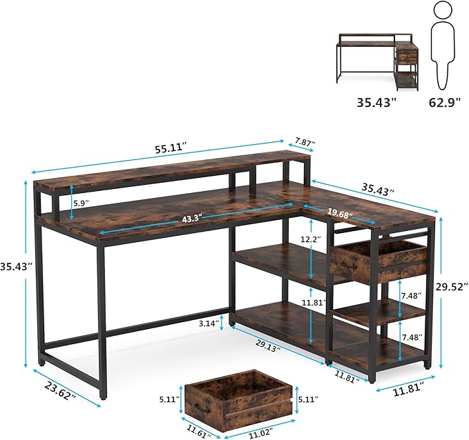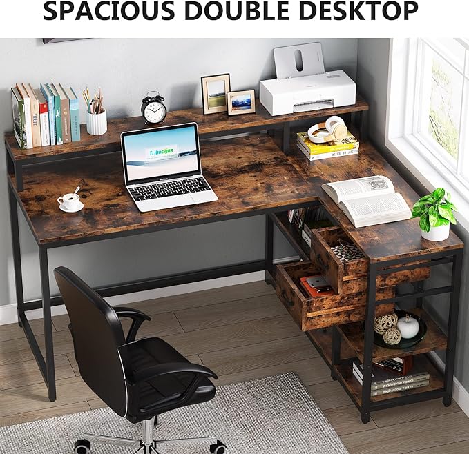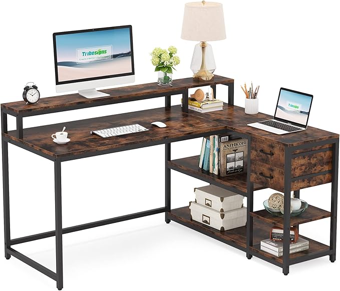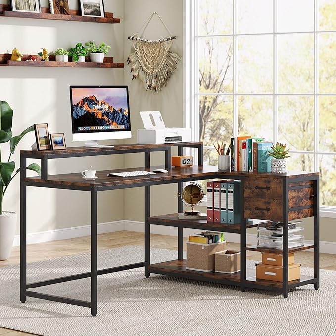 About This L Shaped Desk with Drawer, Industrial Corner Desk Home Office Table with Storage Shelves and Monitor Stand, Rustic...