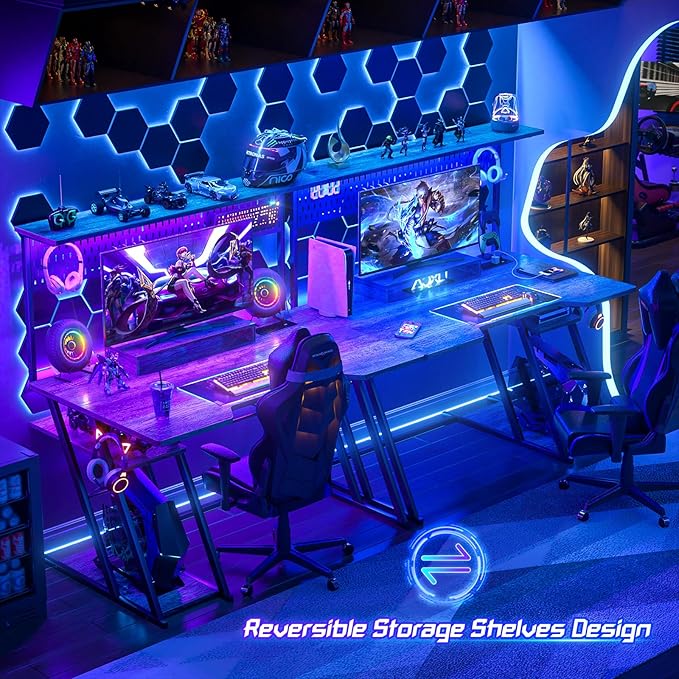 armocity Gaming Computer Desk with Storage Shelves & Z-Shaped Legs, Gaming Desk with Hutch and LED Lights, Reversible PC Gaming Desk with Pegboard for Bedroom & Small Spaces, 47'', Grey Oak