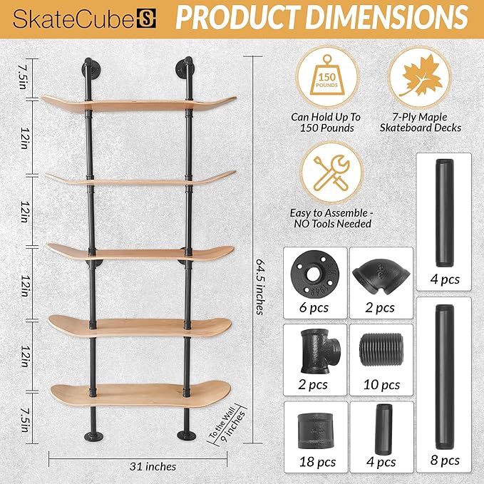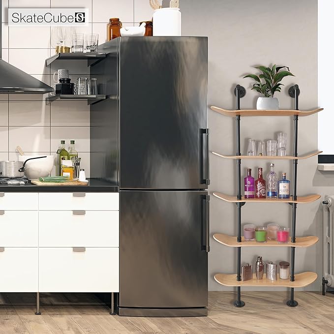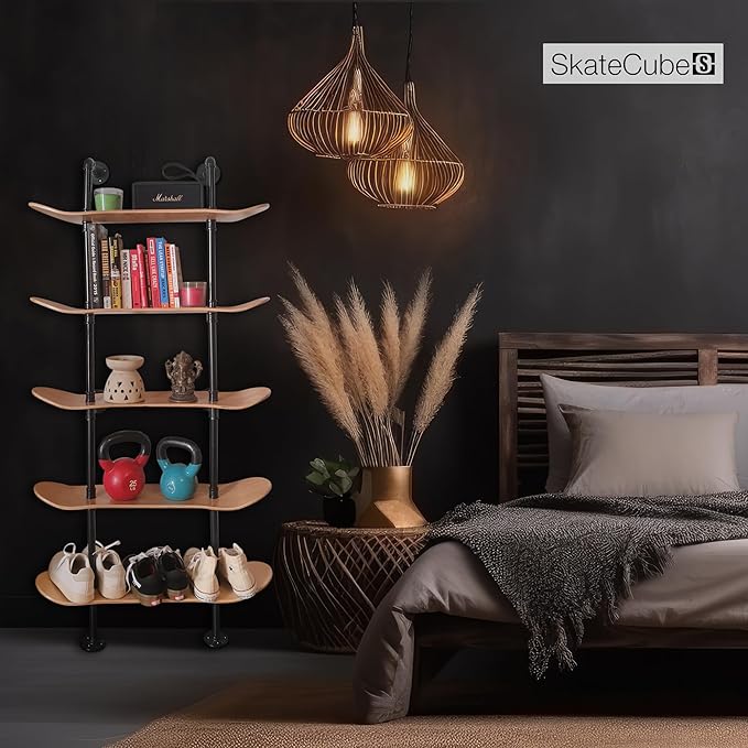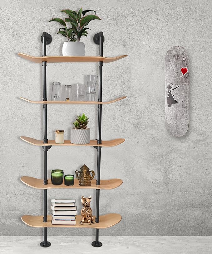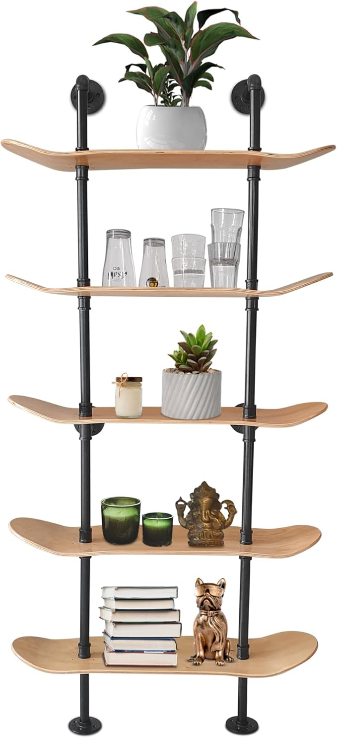 Industrial Shelves - 5 Tier Industrial Decor Pipe Bookcase Using 7 Ply Skateboard Decks - Natural Wood Stain Finish - Bathroom Wall Decor, Living Room Furniture, Book Shelf for Skateboard Enthusiasts