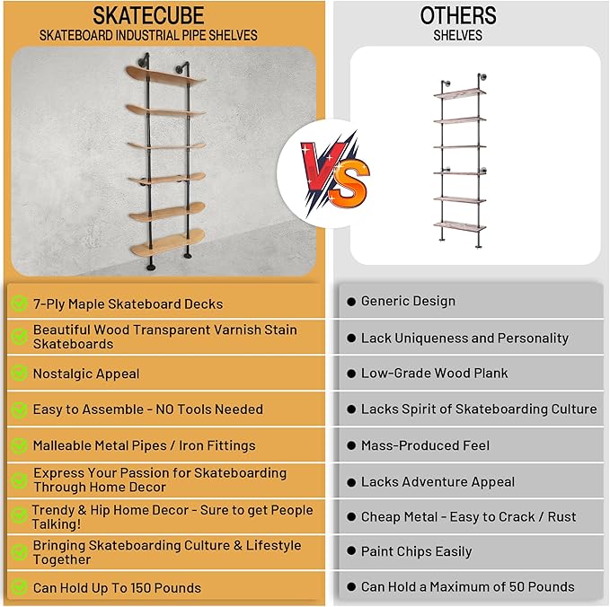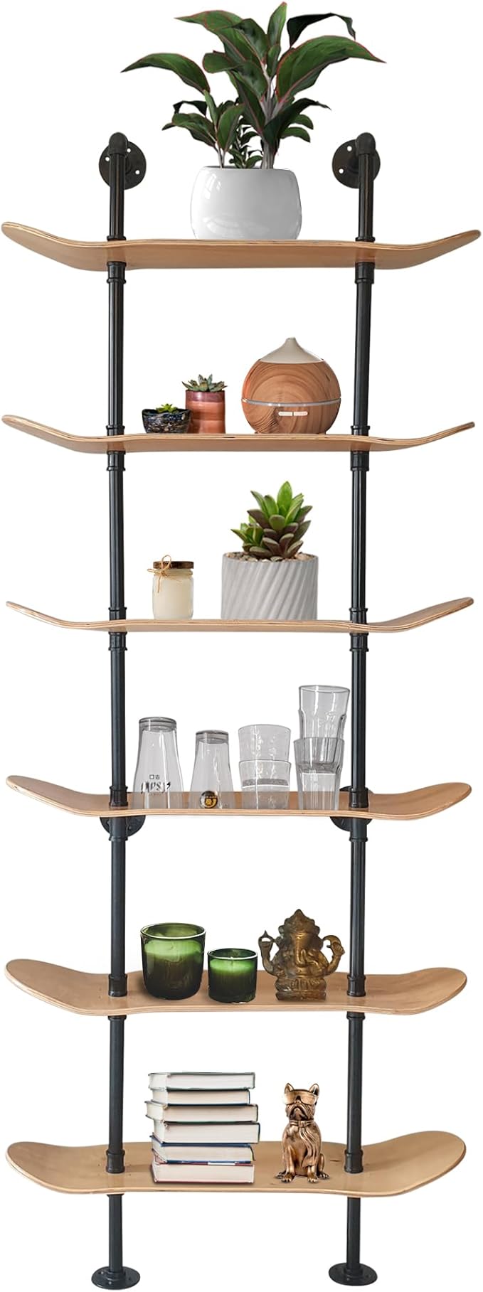 Industrial Shelves - 6 Tier Industrial Decor Pipe Bookcase Using 7 Ply Skateboard Decks - Natural Wood Stain Finish - Bathroom Wall Decor, Living Room Furniture, Book Shelf for Skateboard Enthusiasts