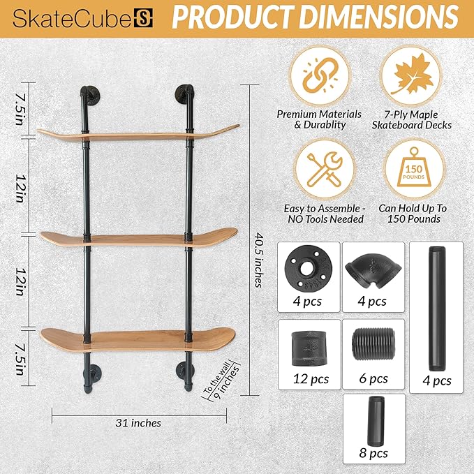 About This URBAN SKATEBOARD AESTHETIC: Floating bookshelf made with 7-ply maple wood skateboard decks and malleable matte black industrial pipes...