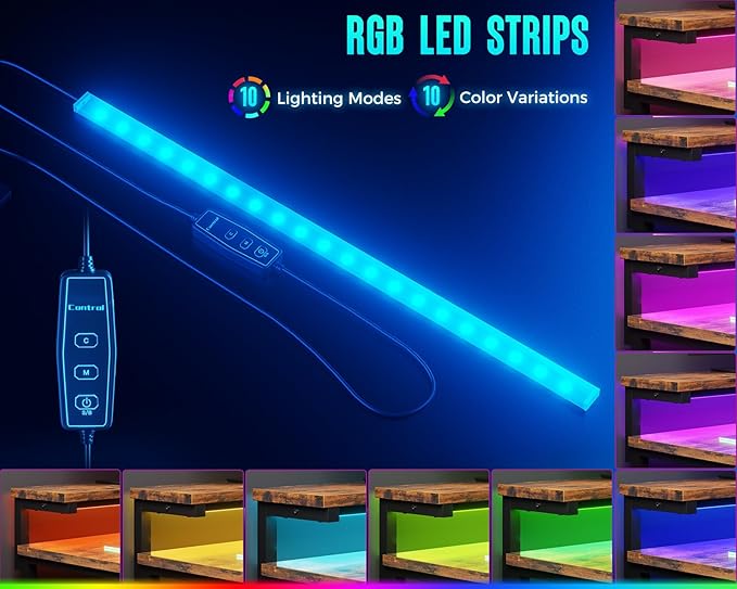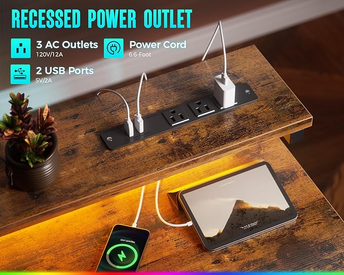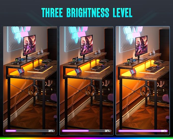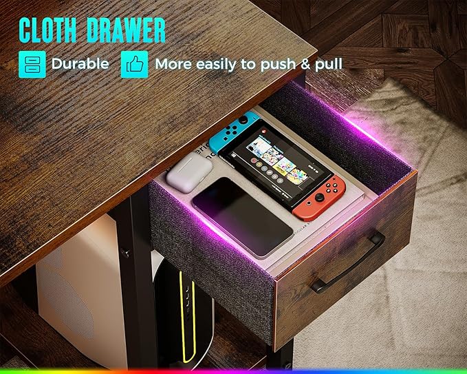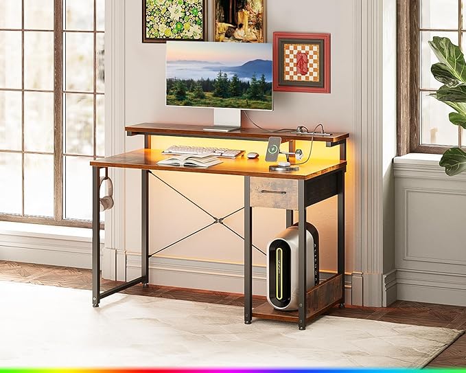AODK Gaming Desk with LED Lights & Power Outlet, 40 Inch Computer Desk with Drawer, Reversible Desk with Adjustable Monitor Shelf & Headphone Hook for Home Office, Rustic Brown