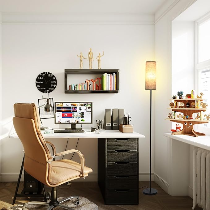 About This 【Modern Standing Floor Lamp】The black spray paint metal floor lamp with cylindrical-shaped linen lampshade can be matched with...