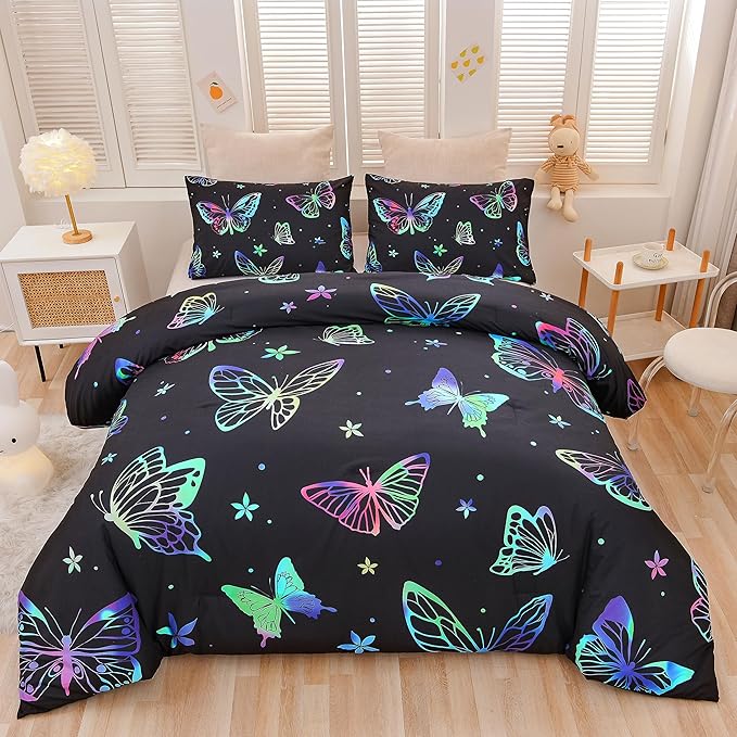 Btargot 3 Piece Butterfly Pattern Girls Comforter Set with 2 Pillow Covers, Gradient Line Rainbow Printed Bedding Set for Women, Queen Black