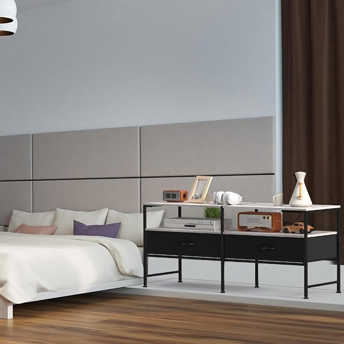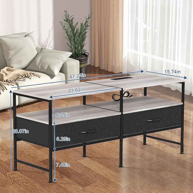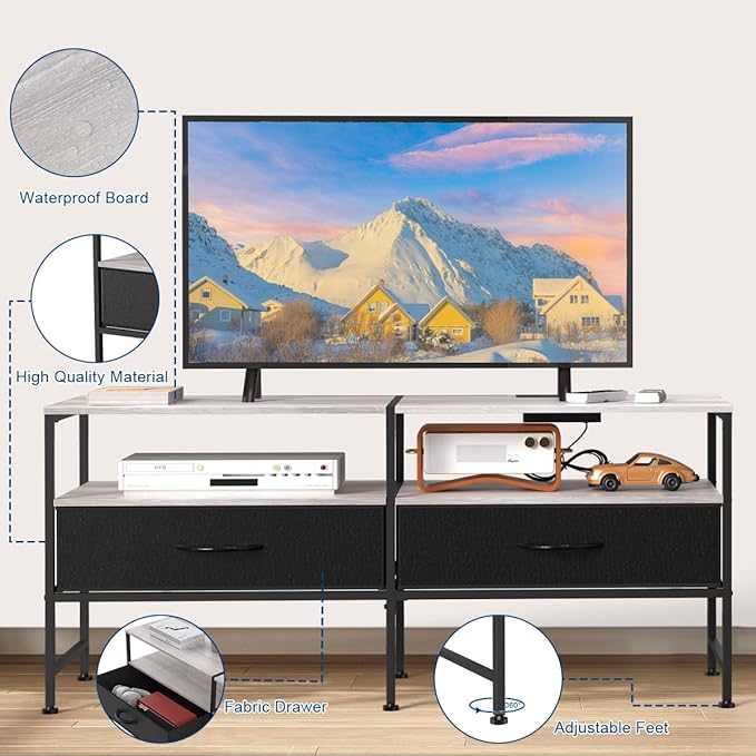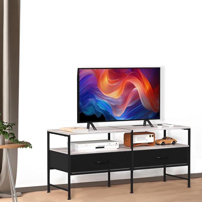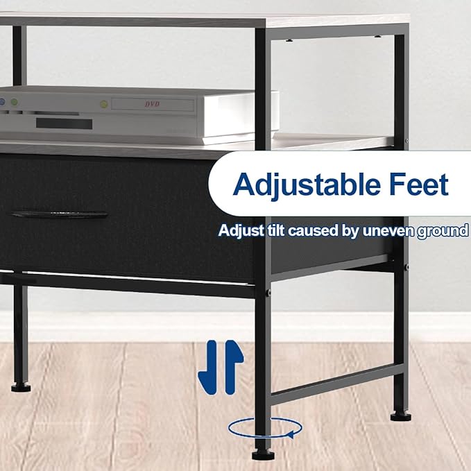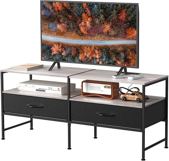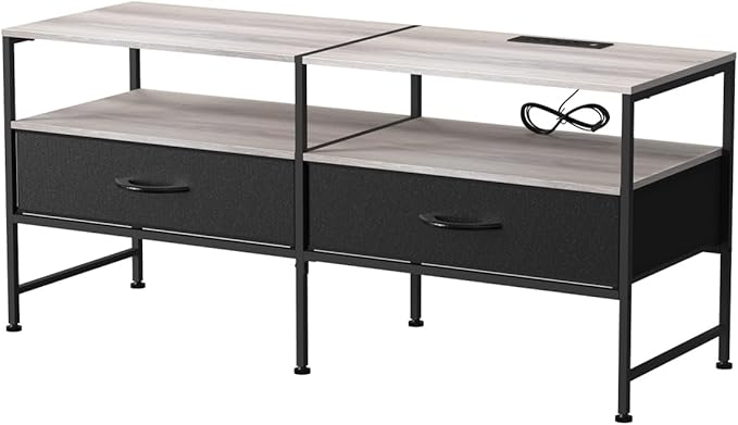 HEOMU Industrial TV Stand for 50 Inch Television Cabinet 3-Tier Console Table with Fabric Drawer, Entertainment Center Media Console Metal Frame for Living Room, Bedroom, Grey