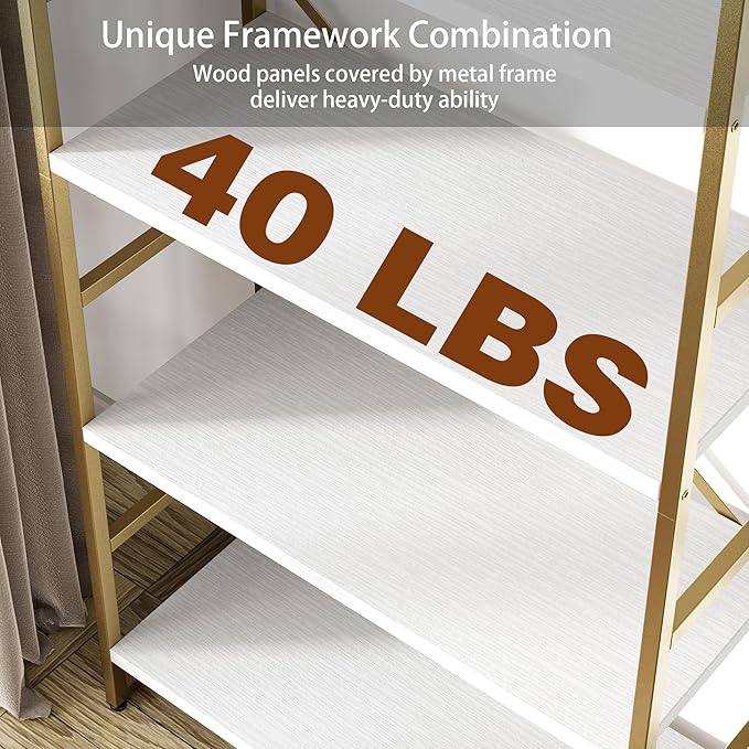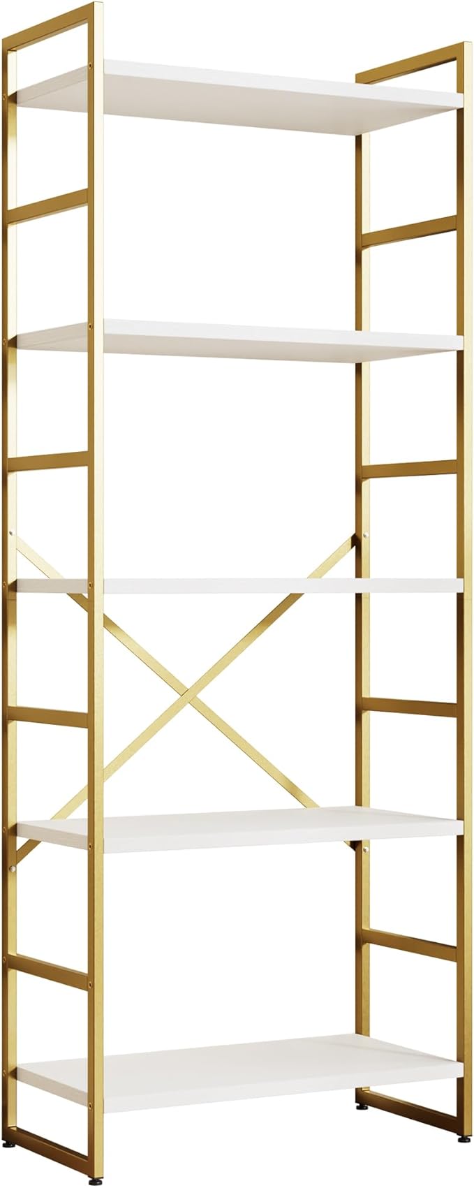 Shintenchi 5 Tiers Bookshelf, Classically Tall Bookcase Shelf,Industrial Book Rack,Modern Book Holder in Bedroom/Living Room/Home/Office, Storage Rack Shelves for Books/Movies,Gold