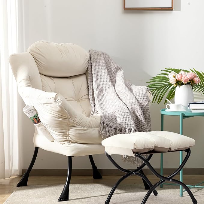 HollyHOME Fabric Lazy Chair with Foldable Ottoman, Accent Comfy Lounge Arm Chair and Folding Footrest Stool Set, Leisure Sofa Reading Chair and Footstool for Living Room, Bedroom, Dorm, Beige