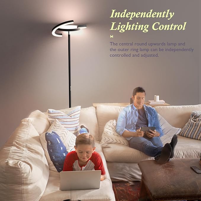 FIMEI Modern Black Metal Saturn Ring LED Floor Lamp, Stepless Dimming and Color Temperature Adjustment, Rotatable Lamp Head, Independent Control of Upwards Round Light and Outer Ring Light