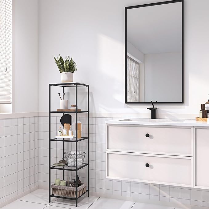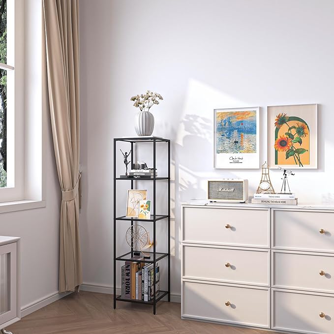 5-Tier Bookshelf,Metal Bookcase,Tempered Glass Shelves,Storage Rack Shelf for Home Office,Living Room,Bedroom, Bathroom,Modern Style, Black