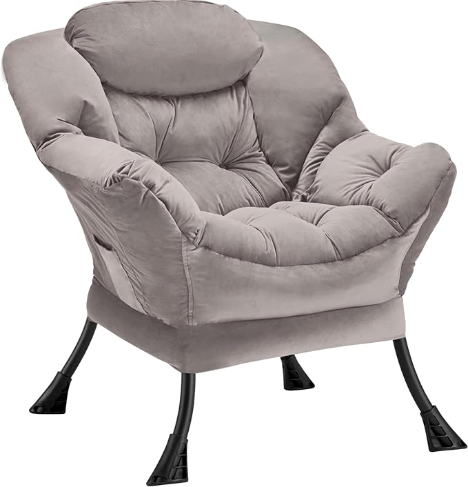 Fabric Lazy Chair Large Accent Chair,Velvet Frabic Modern Lounge Reading Chair with Armrests & Side Pocket,Upholstered Armchair for Living Room,Bedroom,Dorm,Light Grey