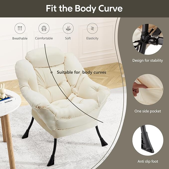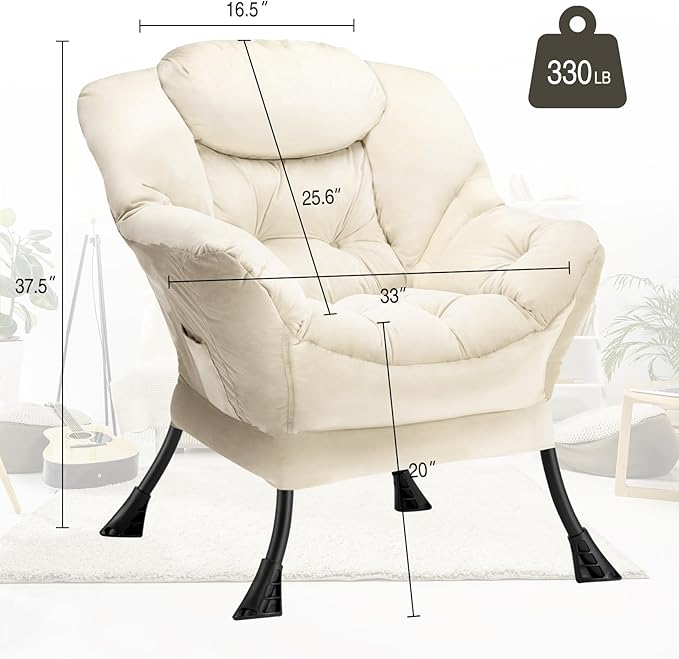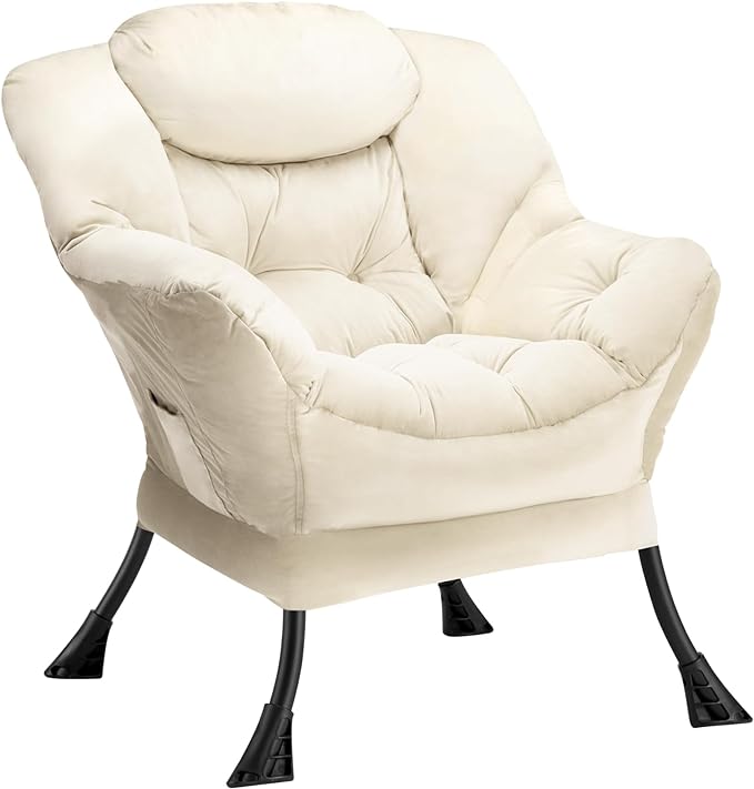 Fabric Lazy Chair Large Accent Chair,Velvet Frabic Modern Lounge Reading Chair with Armrests & Side Pocket,Upholstered Armchair for Living Room,Bedroom,Dorm,Beige