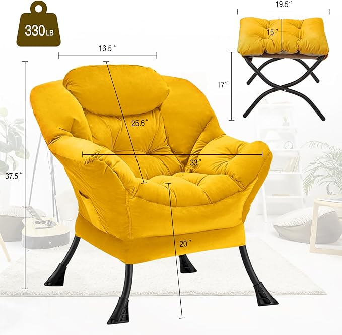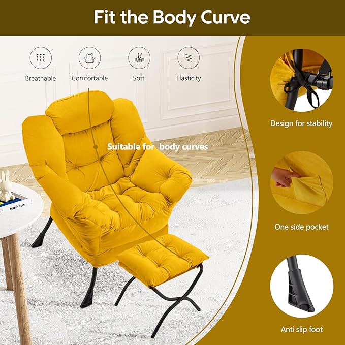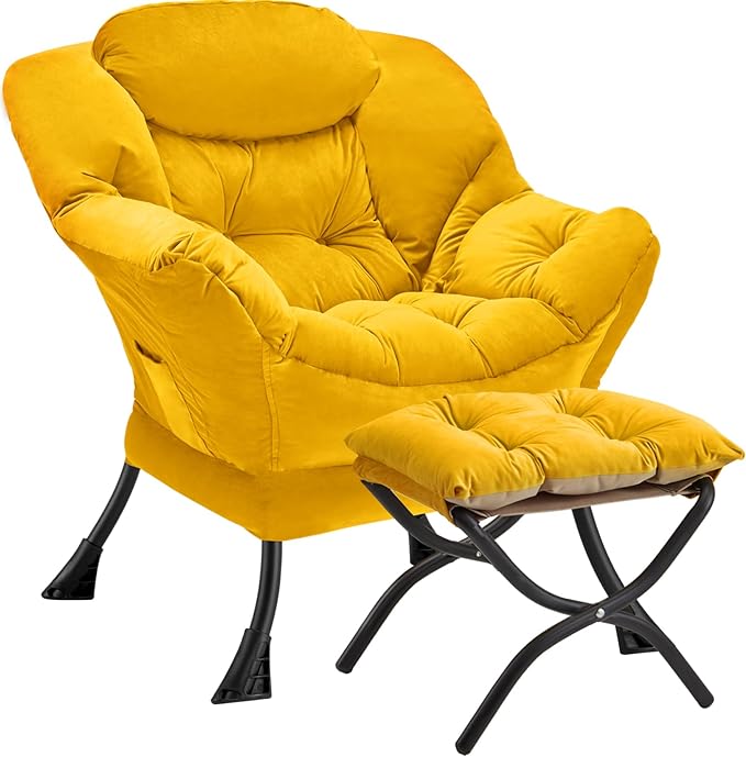 Lazy Chair with Folding Ottoman Modern Large Accent Chair,Contemporary Lounge Leisure Sofa Chair with Armrests Upholstered Sofa Armchair Reading Chair for Bedroom,Dorm & Office,Yellow