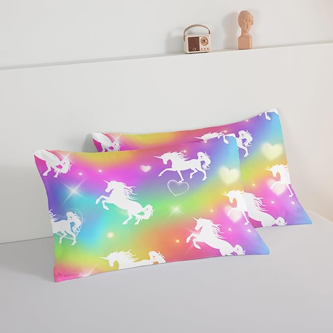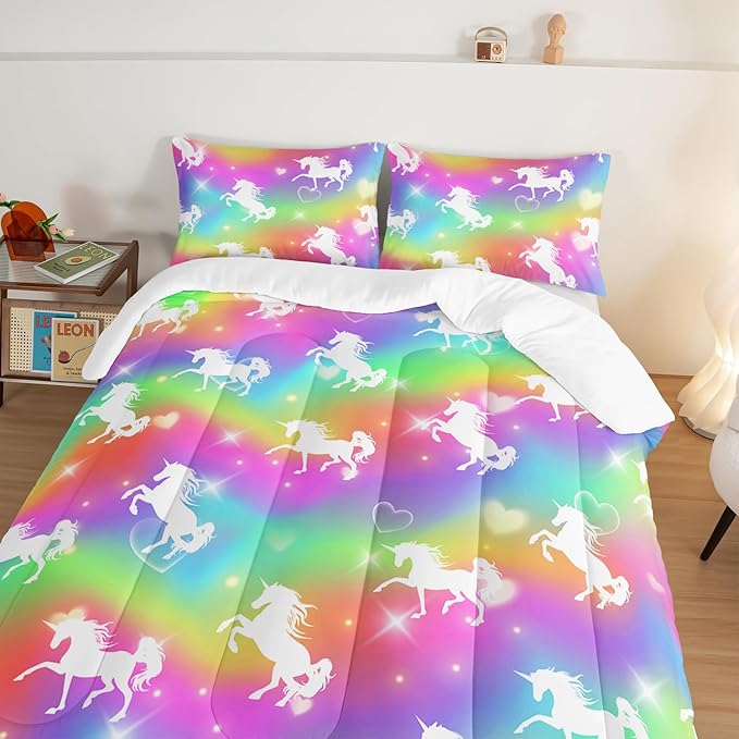 HOSIMA Unicorn Bedding 3pcs Rainbow Comforter Set with 2 Pillowcases,Sparkle Stars Full Size Bed in a Bag Set for Adults Teen Girls,Cute Rainbow Unicorn Comforter Princess Toddler Bedding Set.
