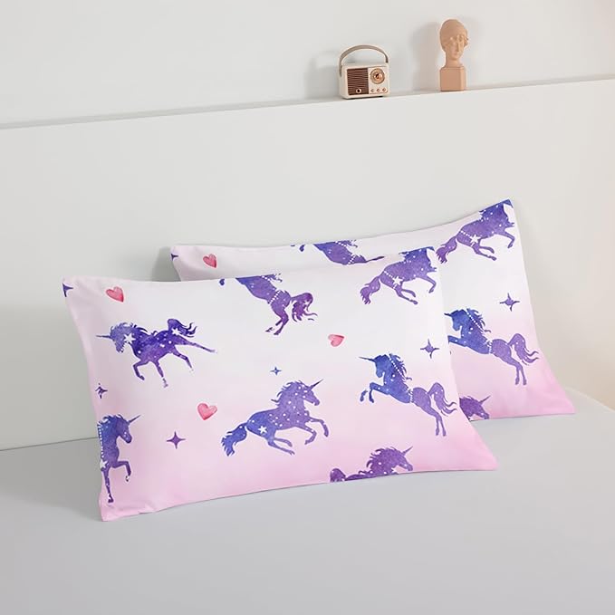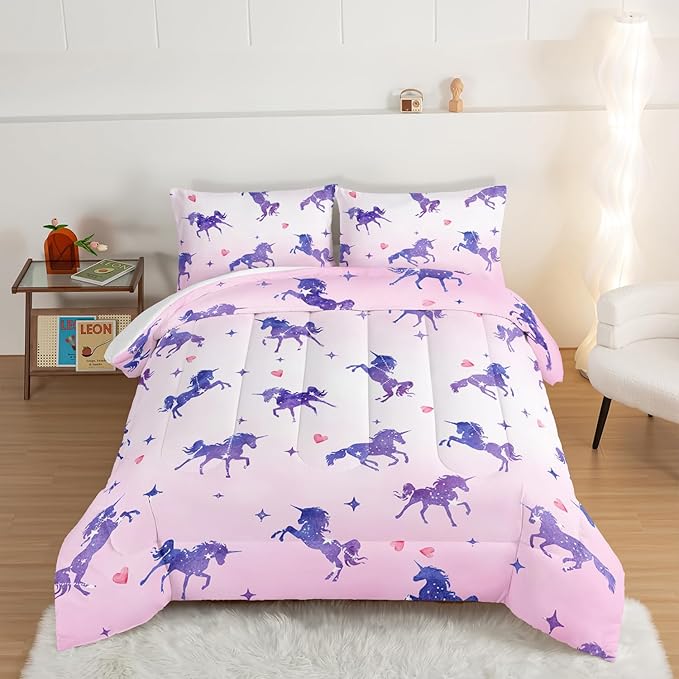 HOSIMA Kawaii Unicorn Comforter,Purple Unicorn with Stars and Love Heart Princess Toddler Bedding Set-Soft Microfiber Full Size Bed in a Bag,Fairycore Room Decor Pink Comforter with 2 Pillowcases.
