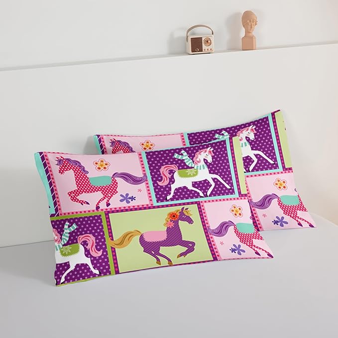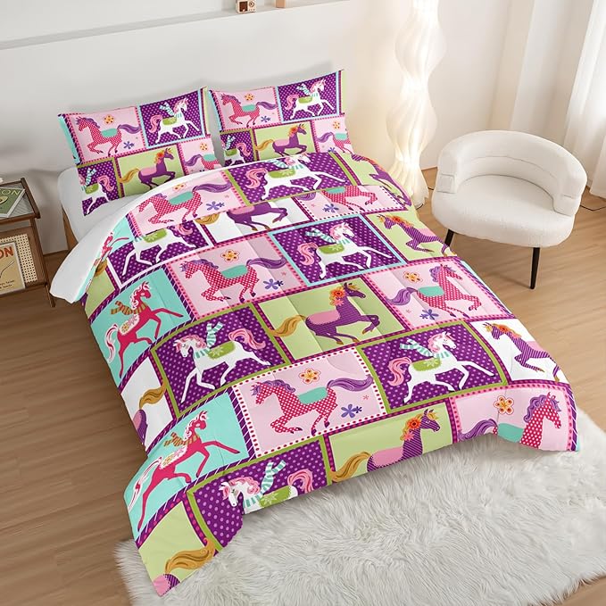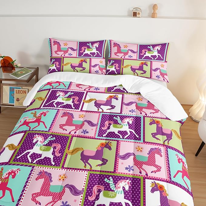 HOSIMA 3Pcs Kawaii Kids Horse Comforter Set with 2 Pillowcases,Colorful Dots Style Full Size Bed in a Bag Set for Adults Teens Princess Toddler Bedding Set,Horse Pony Full Size Comforter Sets.