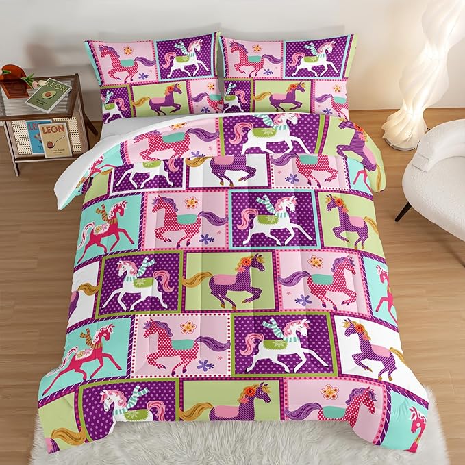 HOSIMA 3Pcs Kawaii Kids Horse Queen Comforter Set with 2 Pillowcases,Colorful Dots Style Comforter for Adults Teens Princess Toddler Bedding Sets Queen,Horse Pony Comforter Set.