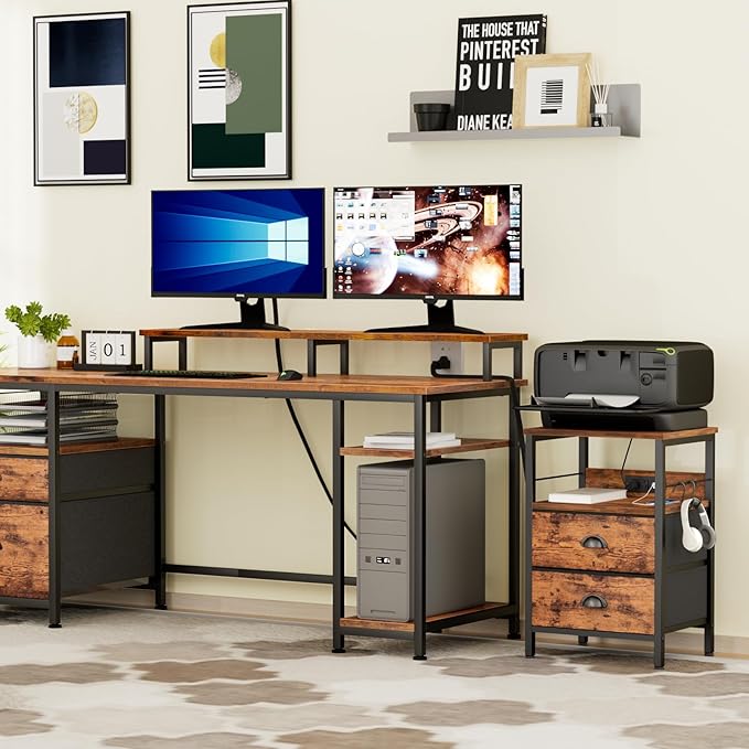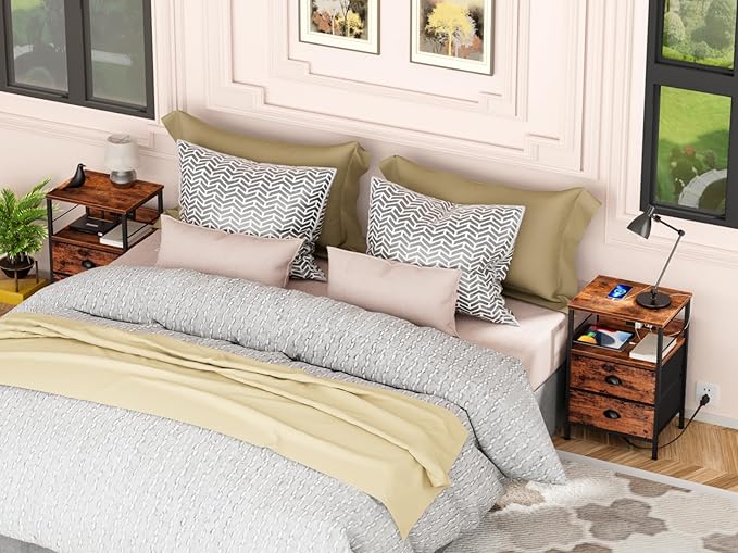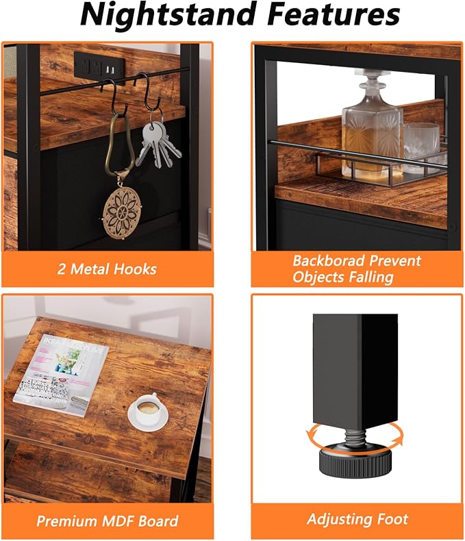 Furologee End Table with Charging Station, Nightstand with Fabric Drawers, Side Table with USB Ports & Outlets, Night Stand with Storage Shelf & Hooks, for Living Room/Bedroom, Rustic Brown