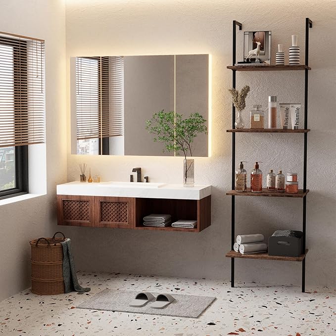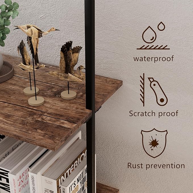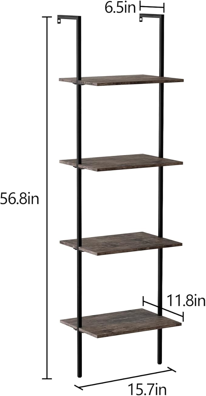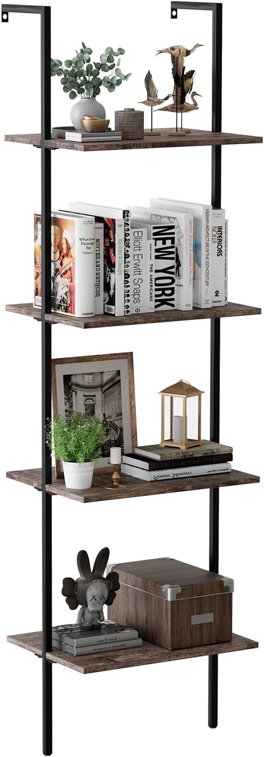 Ladder Shelf 4 Tiers Metal Industrial Bookshelf,Brown Wood Tall Open Storage Rack and Display Shelves,Wall Mount Wide Book Case for Home Office Bedroom,Small