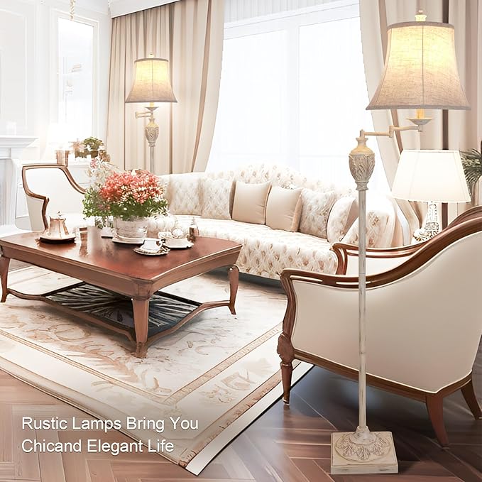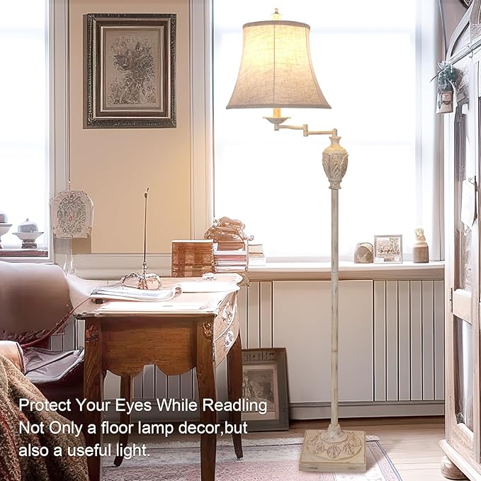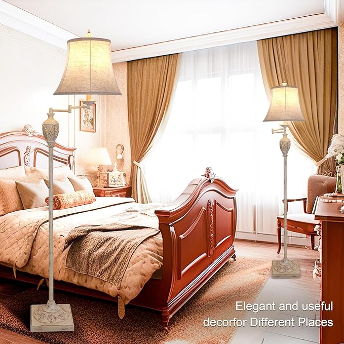 Traditional LED Floor Lamp with 350° Adjustable Swing Arm Lamp – Vintage Pole lamp Swing arm for Living Room, Bedroom and Office – Rustic Upright Floor Light for Home Décor with Silk Fabric Shade