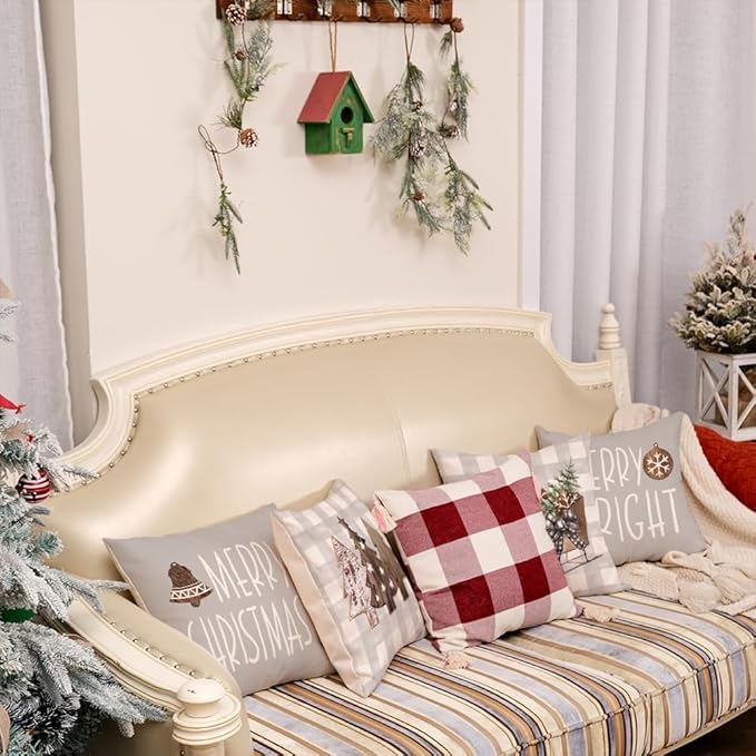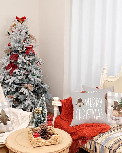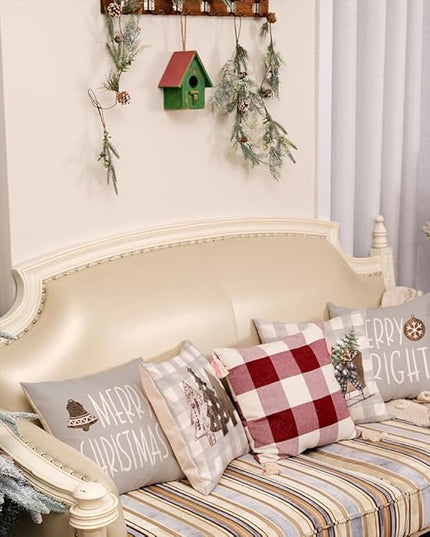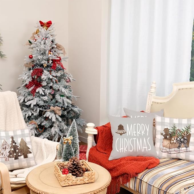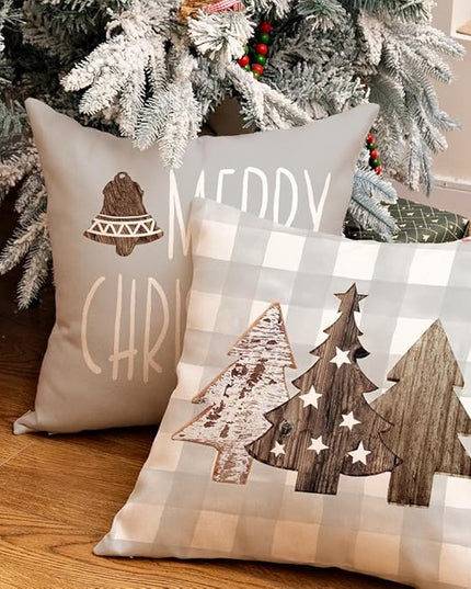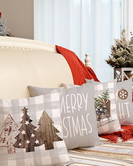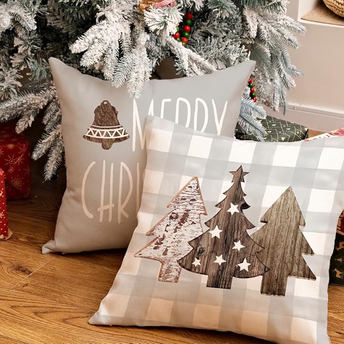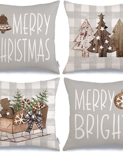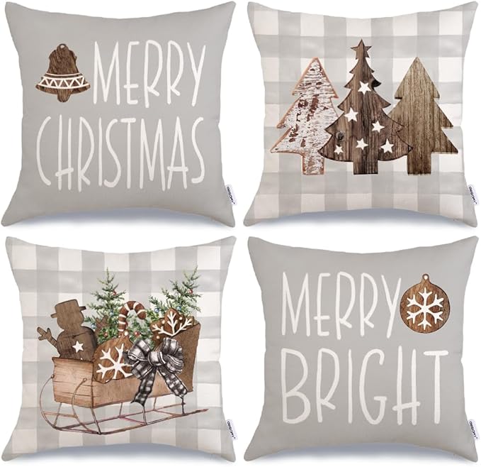 GEEORY Christmas Pillow Covers 18 x 18 Inch Set of 4, Buffalo Plaid Wooden Tree Snow Sleigh Merry Xmas Holiday Decor Decorative Throw Cushion Cases Decoration for Home Party Sofa Couch (Beige)