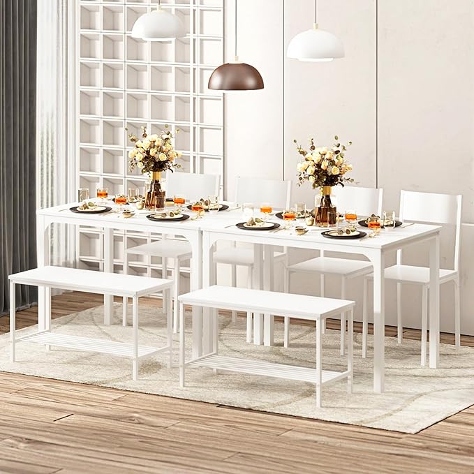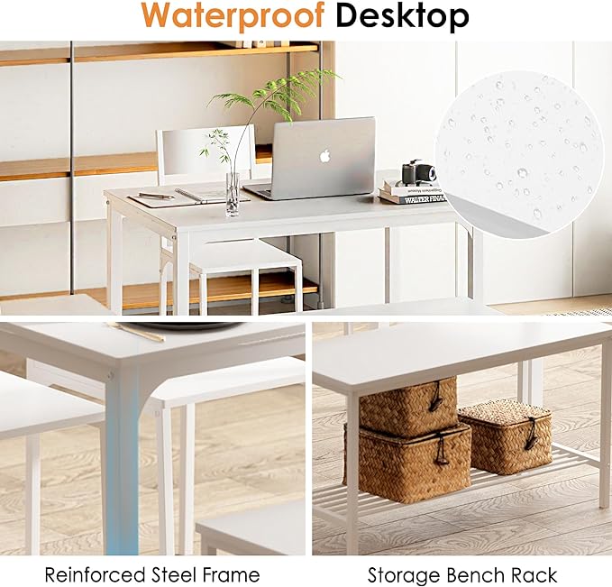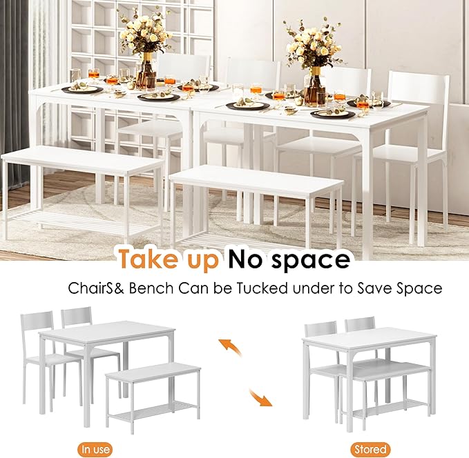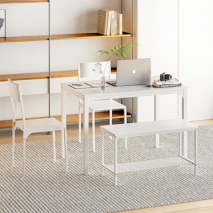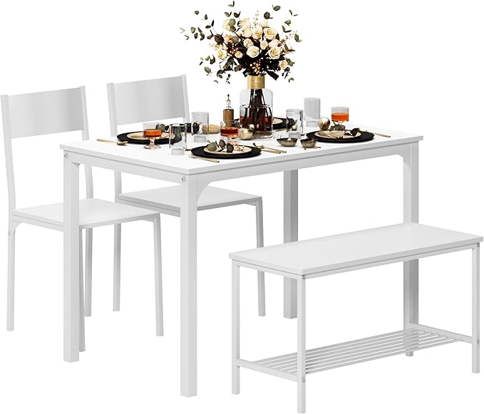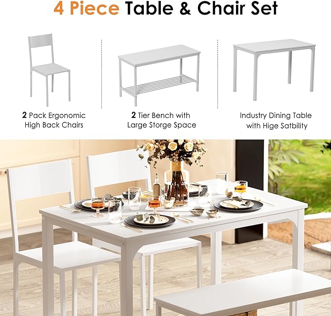 sogesfurniture 4 Piece Dining Table Set, Dinette Set Kitchen Table with Bench and Chairs, Kitchen Dinner Table with Benches for 4, includes Table, 2 Chairs & Bench,White