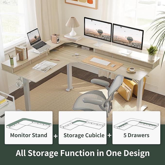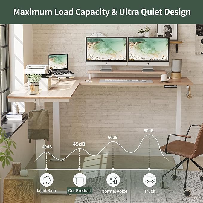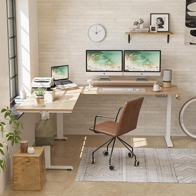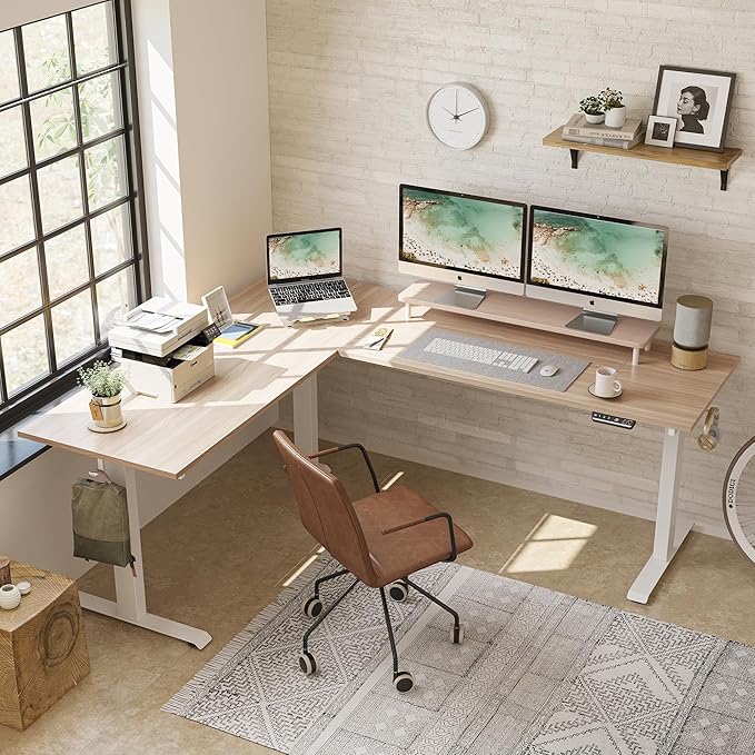 FEZIBO 75 Inches Triple Motor L Shaped Standing Desk Reversible, Electric Height Adjustable Corner Stand up Desk, Sit Stand Desk Computer Workstation, White Frame/Light Walnut Top