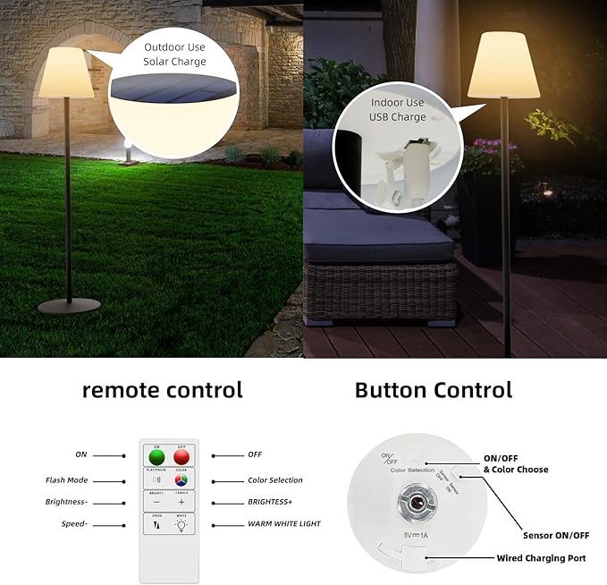 Solar Floor Lamp for Patio Waterproof, Outdoor Floor Lamp with Light Sensor, USB Rechargeable Cordless Floor Lamp with Remote, Dimmable Warm White and Height Adjustable for Lawn Yard Pool Garden