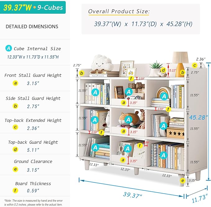 Wooden Cube Bookcase with Legs - 3-Tier Open Shelf Kidsroom Sorted Storage Cabinet Organizer for Books and Toys, 9-Cube Lattice Cute Cubby Bookshelf in Pearl White, 39" W