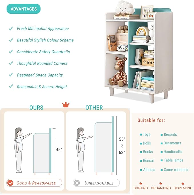 Wooden Cube Bookcase with Legs - 3-Tier Open Shelf Kidsroom Sorted Storage Cabinet Organizer for Books and Toys, 5-Cube Lattice Cute Cubby Bookshelf in White Mixed Westlake Blue, 24" W