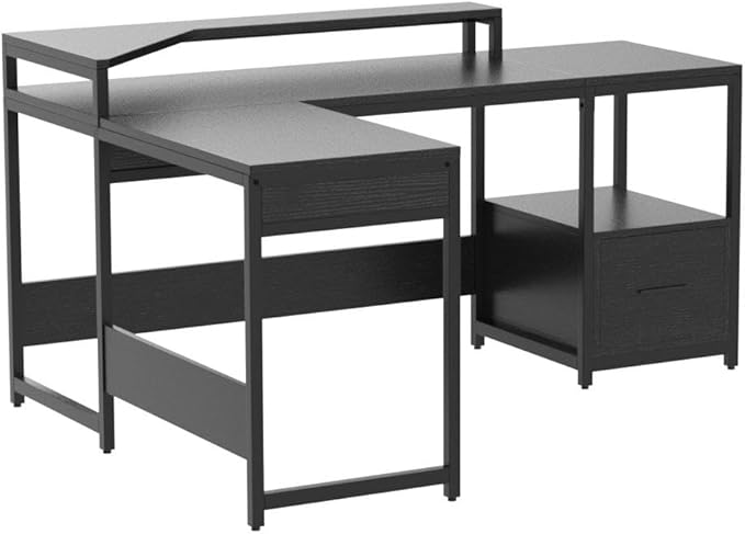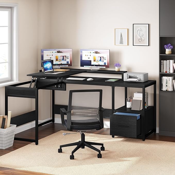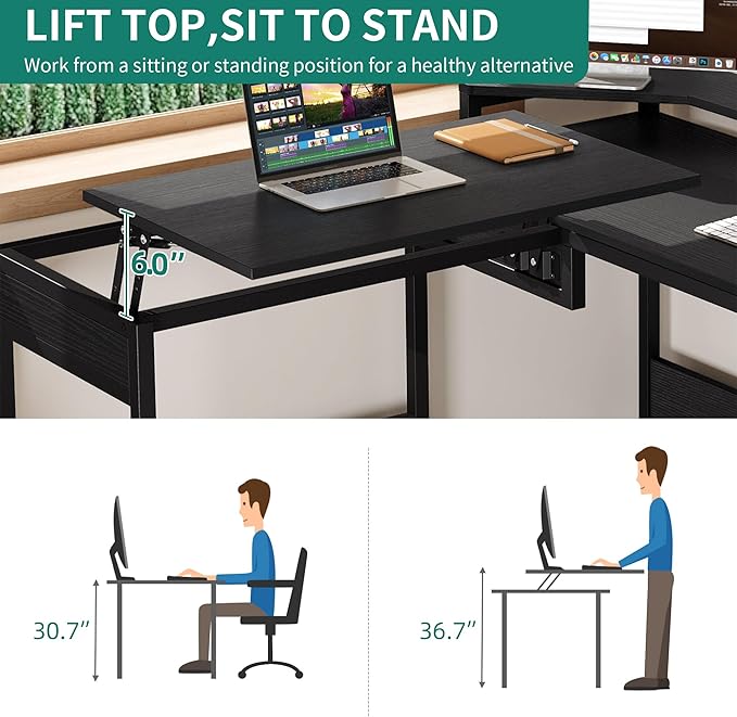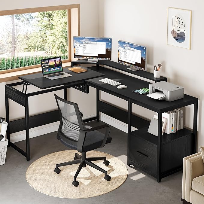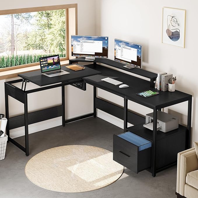 YITAHOME L Shaped Desk with File Drawer, 65" Large Computer Desk Corner Desk with Lift Top, Standing Desk Height Adjustable with Monitor Stand & Storage Shelves for Home Office, Black