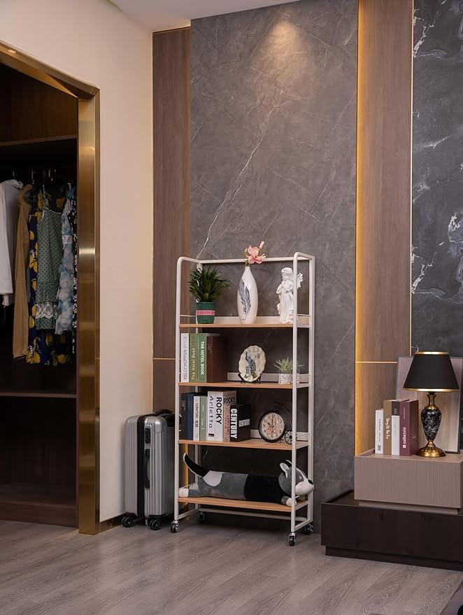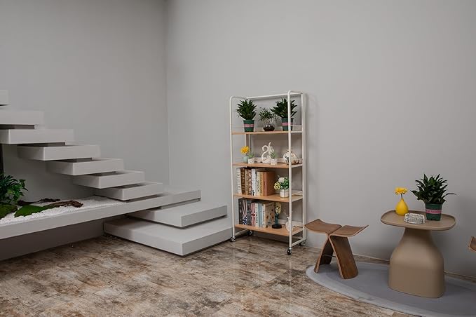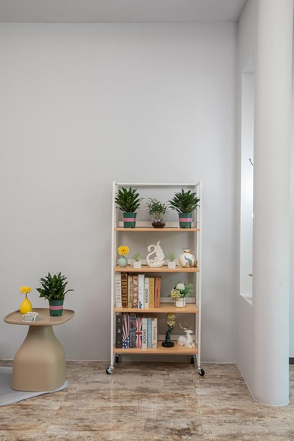 No-Assembly Folding Bookshelf Storage Rack Shelves with Castors 4 Tiers Vintage Bookcase Standing Racks Multifunctional Plant Flower Stand Study Organizer for Home Office (Wood,White)