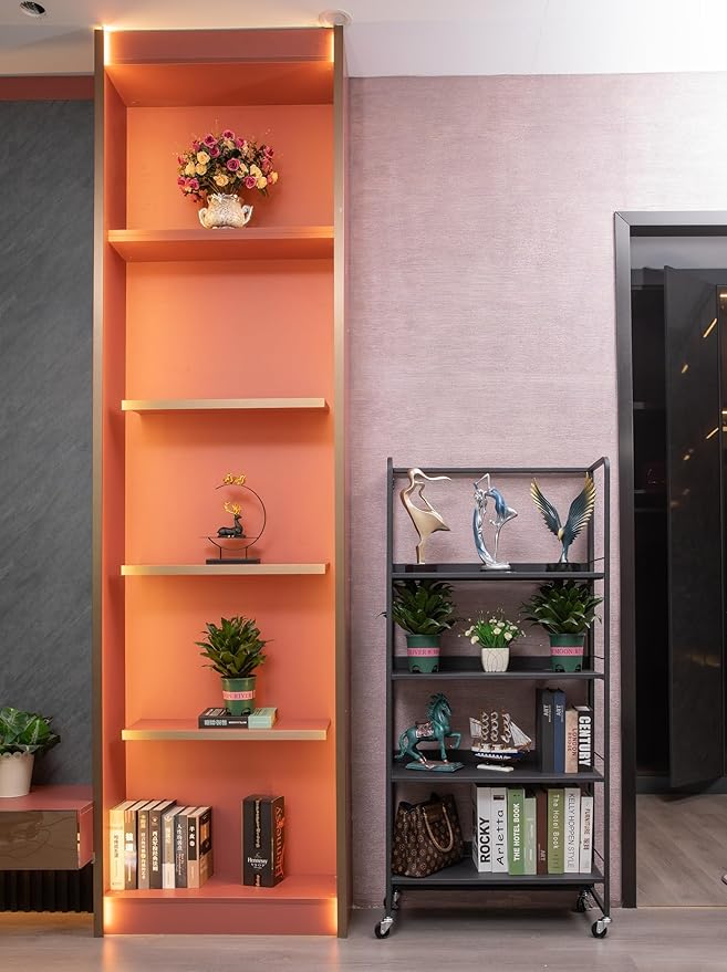 No-Assembly Folding Bookshelf Storage Rack Shelves with Castors 4 Tiers Vintage Bookcase Standing Racks Multifunctional Plant Flower Stand Study Organizer for Home Office (Metal,Deep Grey)