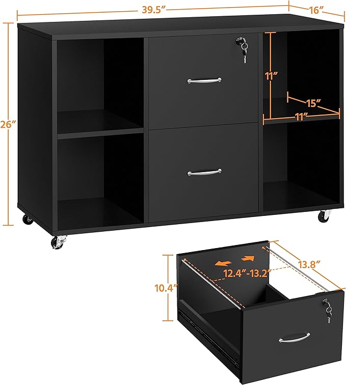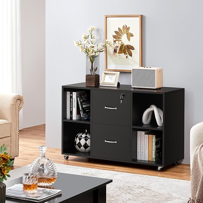 Yaheetech Black File Cabinet Large Mobile Storage Lateral Filing Cabinet with 2 Drawer and 4 Open Compartments,for Letter Size A4 Size, Printer Stand for Home Office, Black