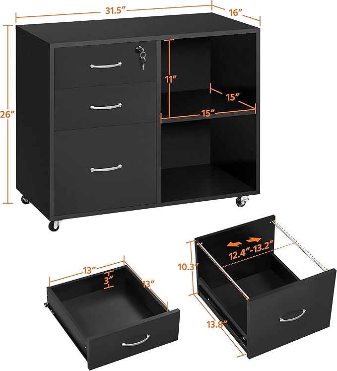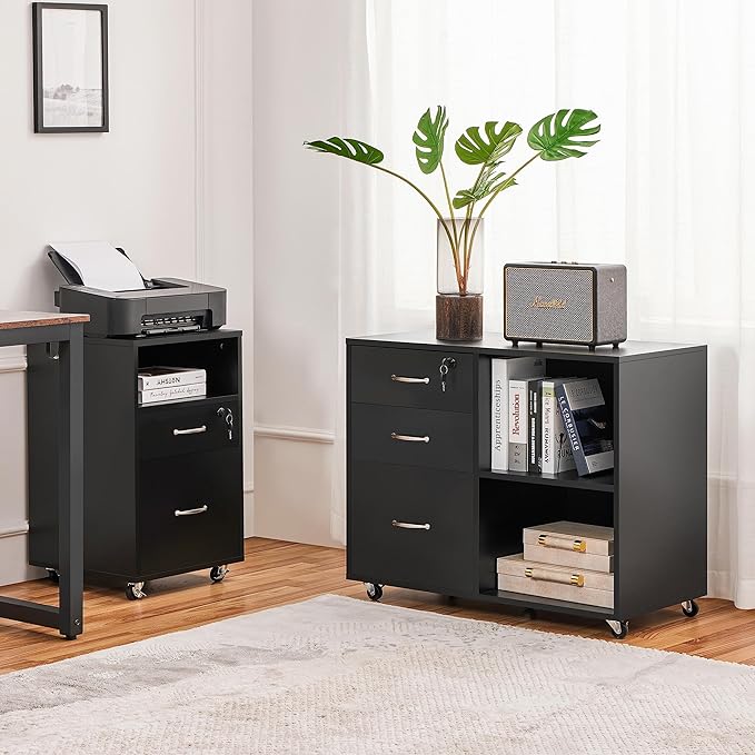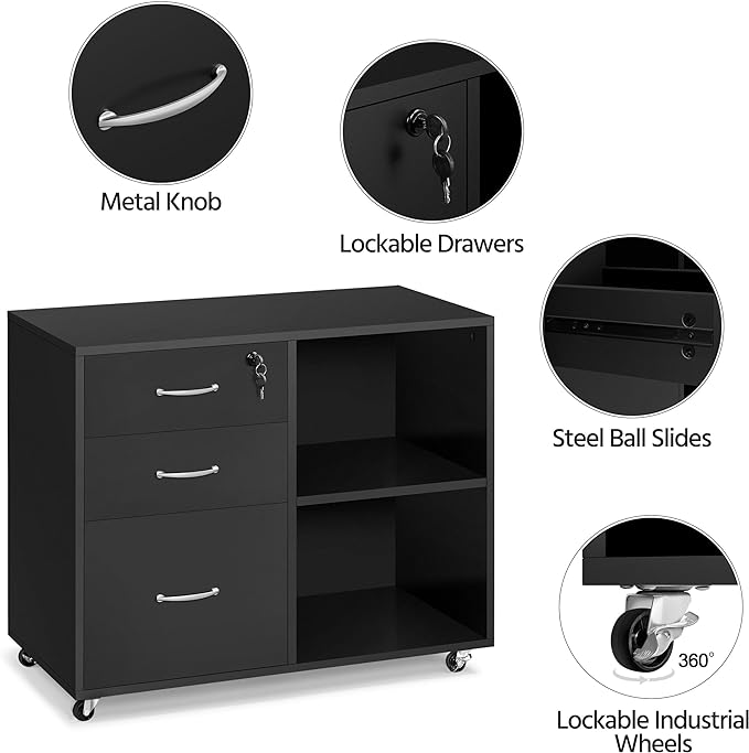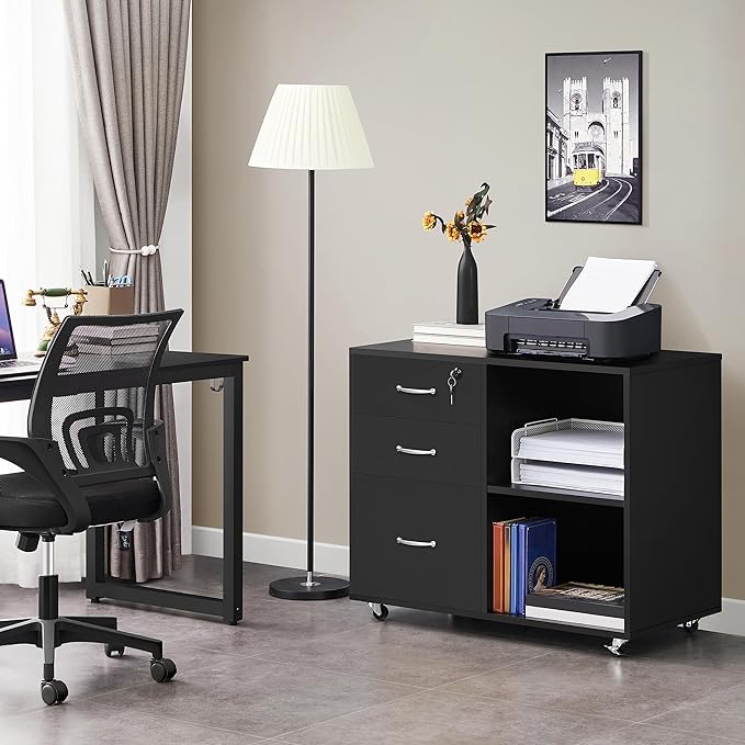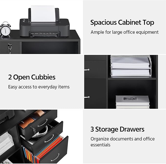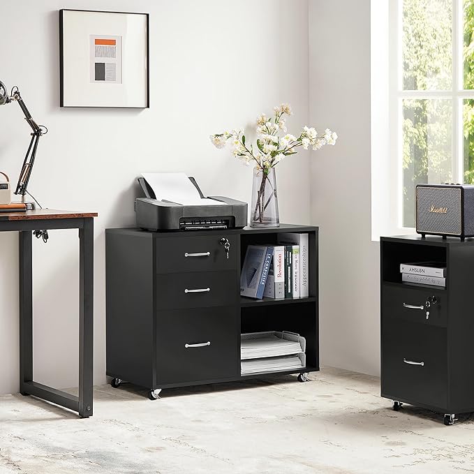 Yaheetech Black File Cabinet with Lock for Letter, A4 Size,3 Drawer Lateral Filing Cabinet Printer Stand with Open Storage Compartments,Mobile Filing Cabinet for Home Office, Black