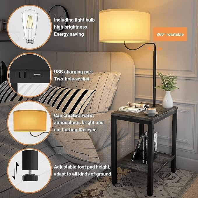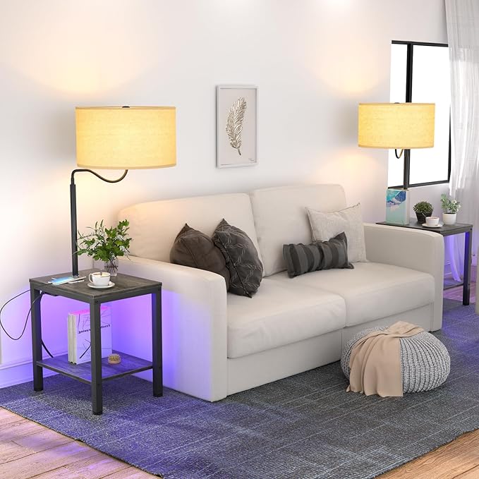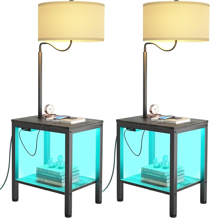 LED Floor Lamp with Table, Side Table with LED Light and Power Outlet, Nightstand with Lamp, End Table with Lamp Attached for Living Room, Bedroom, USB Ports, Bulb Included, Black Oak, 2 Pack