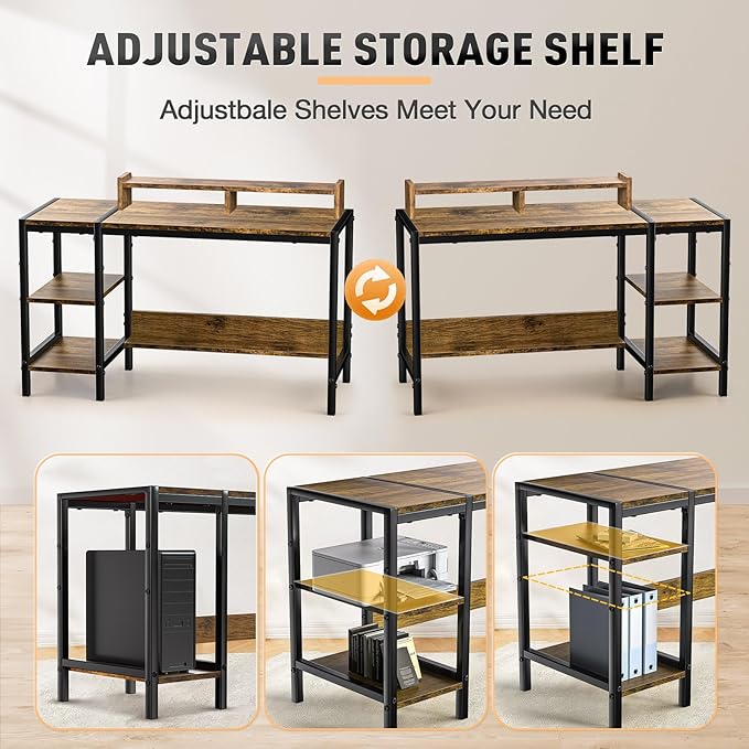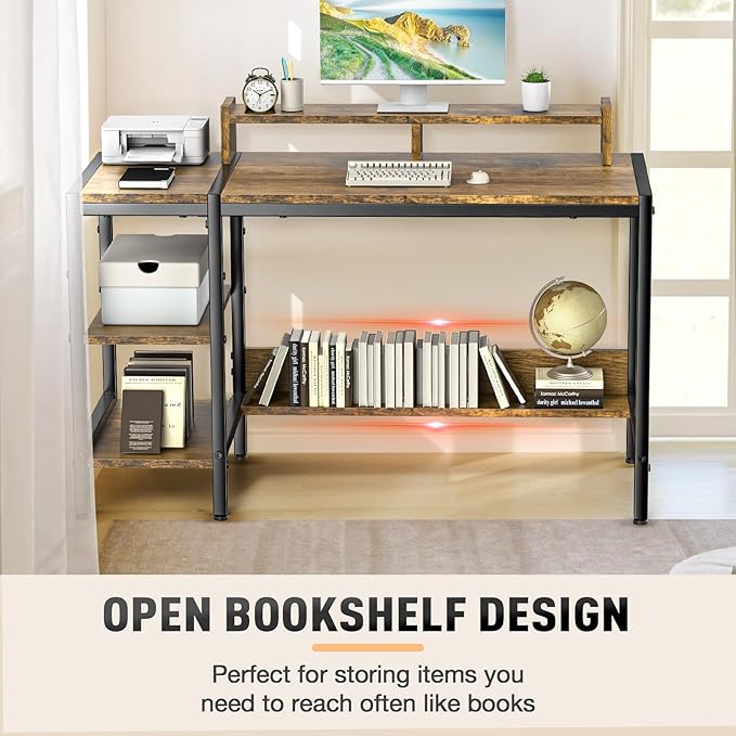 Gimars Upgrade 47” Computer Home Office Desk with Monitor Stand, Rustic Writing Desk with Adjustable Shelves & Large Bookshelf, Easy Assembly Gaming Desk, Spacious, Modren Design for Home Office