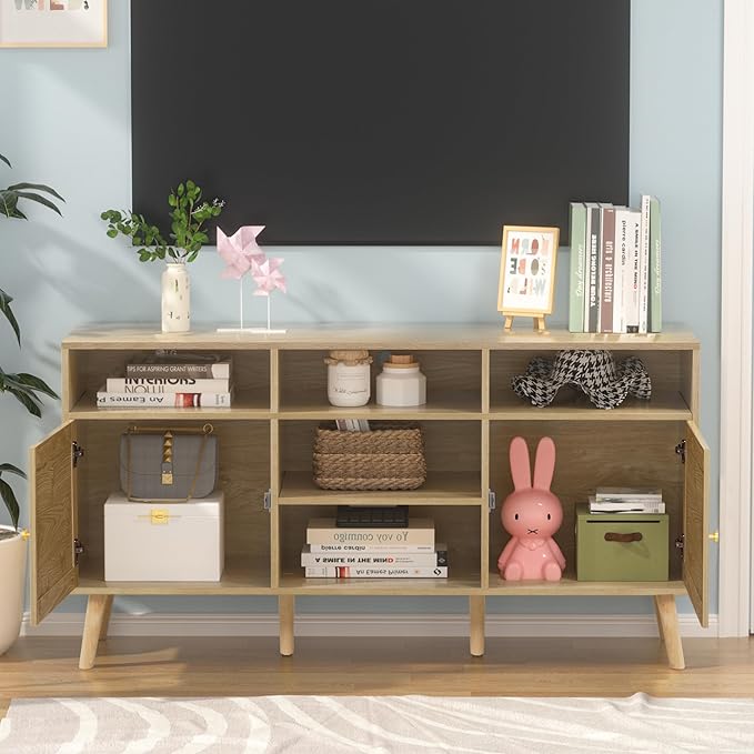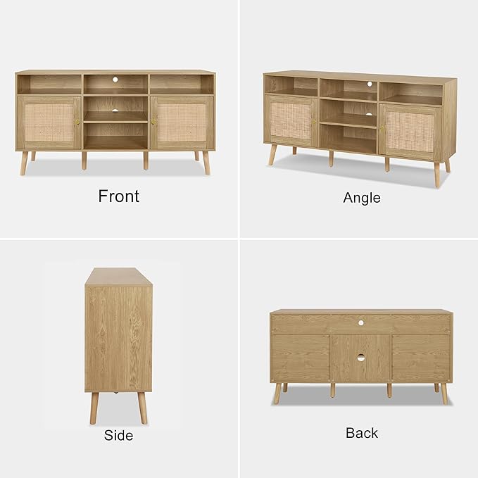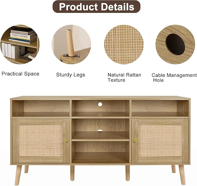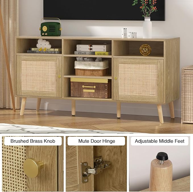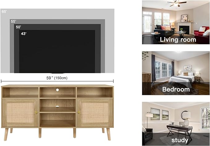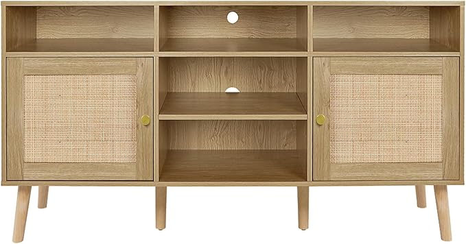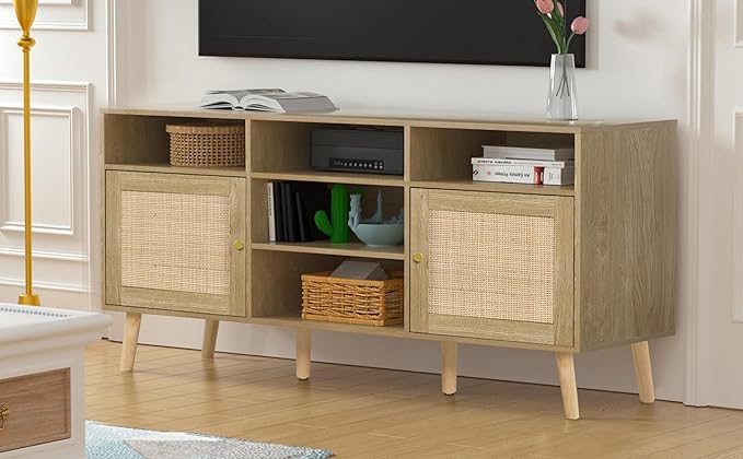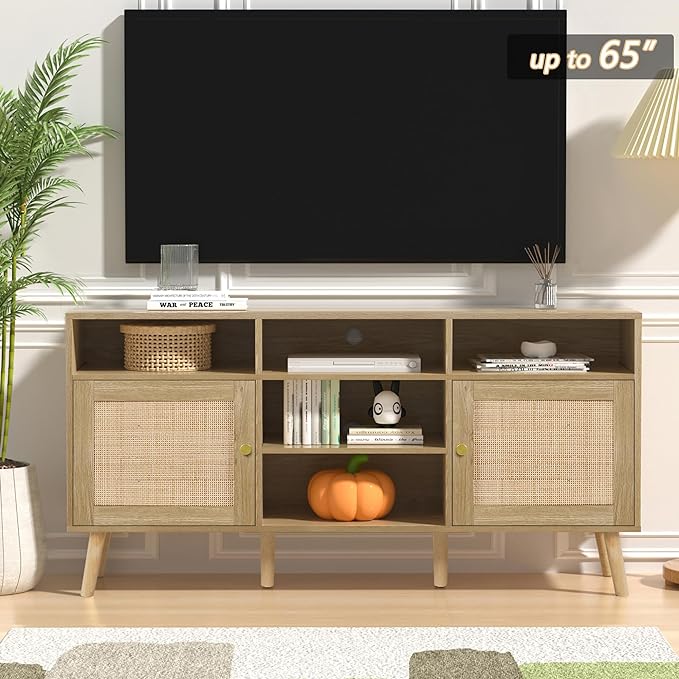 Anmytek Rattan TV Stand for TV up to 65inch,30'' Tall Farmhouse TV Stand Mid Century Modern TV Stand with Storage TV Console Entertainment Center Media Cabinet for Living Room Bedroom