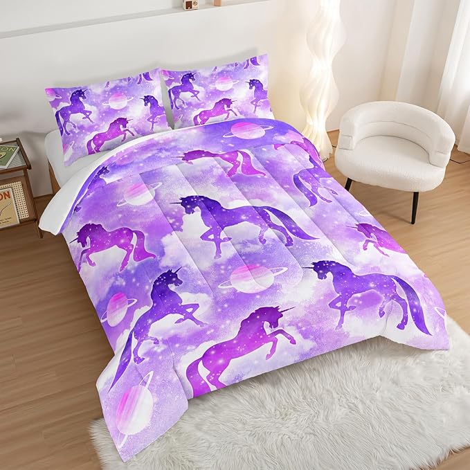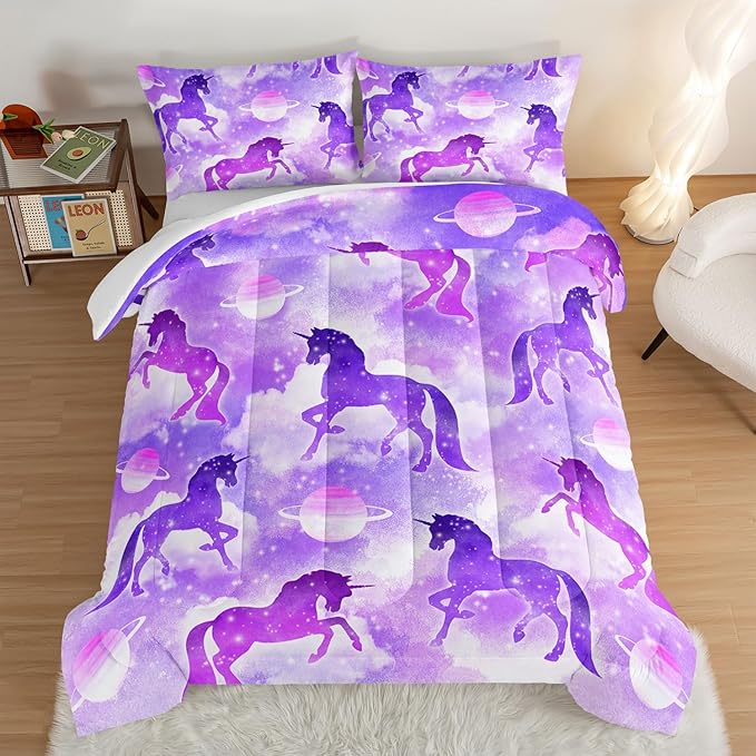 HOSIMA Purple Unicorn Twin Bedding Sets for Girls Kids,3 Piece Soft Microfiber Galaxy Comforter Princess Crib Bedding Set Unicorn Bedroom Decor for Girls Room,Planet Cloud Twin Bed in a Bag.