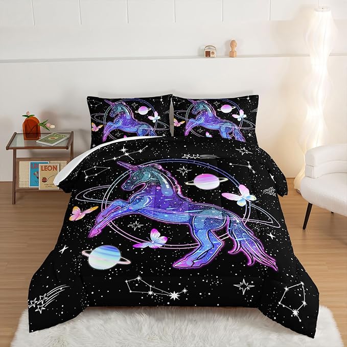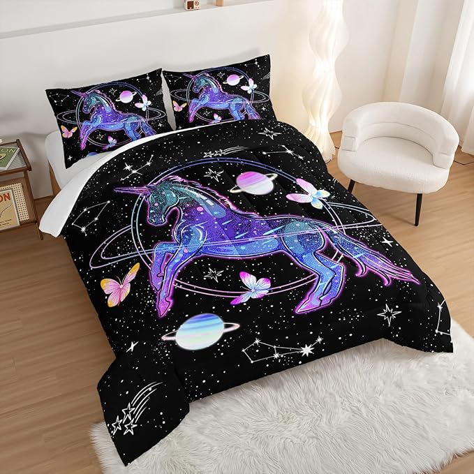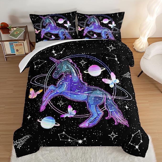HOSIMA Unicorn Bedding Sets for Girls Kids,Butterfly Star Empty Galaxy Comforter,Unicorn Bedroom Decor for Girls Boys,Soft Microfiber Black Queen Comforter Set,Butterfly Crib Bedding Set.