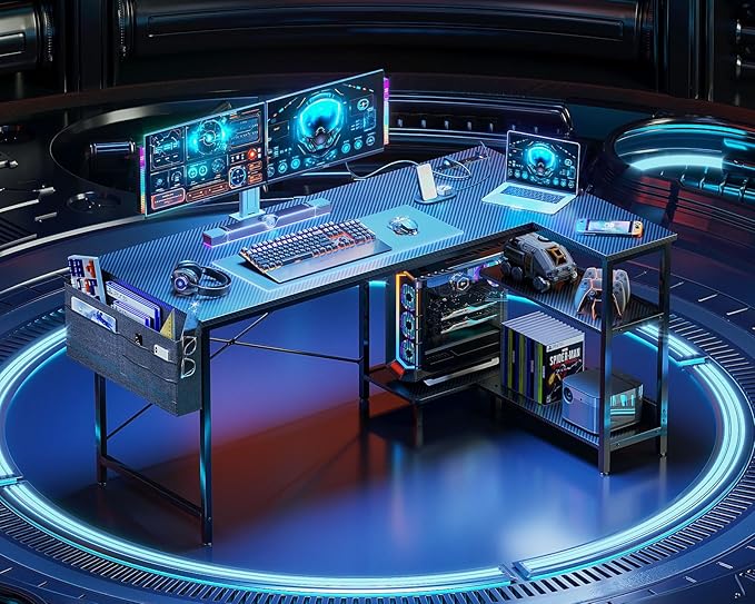 ODK 55 Inch L Shaped Gaming Computer Desk with Power Outlets,Corner Desk with Reversible Storage Shelves & PC Stand for Small Space, Modern Simple Home Office Table, Carbon Fiber Surface, Black