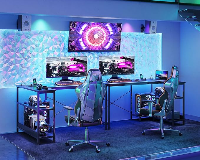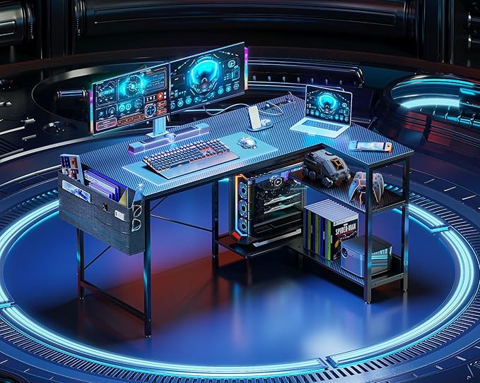 ODK 48 Inch Small L Shaped Gaming Computer Desk with Power Outlets,Corner Desk with Reversible Storage Shelves & PC Stand for Small Space, Modern Simple Home Office Table, Carbon Fiber Surface, Black