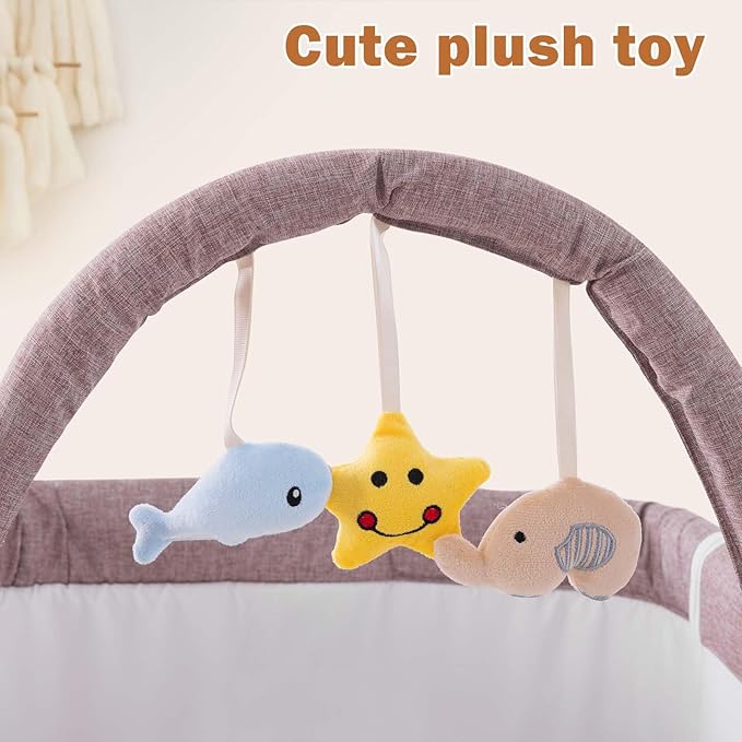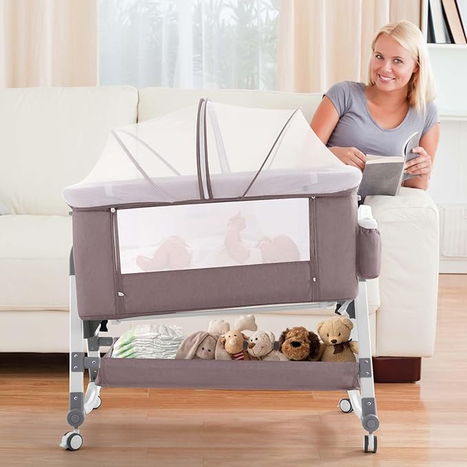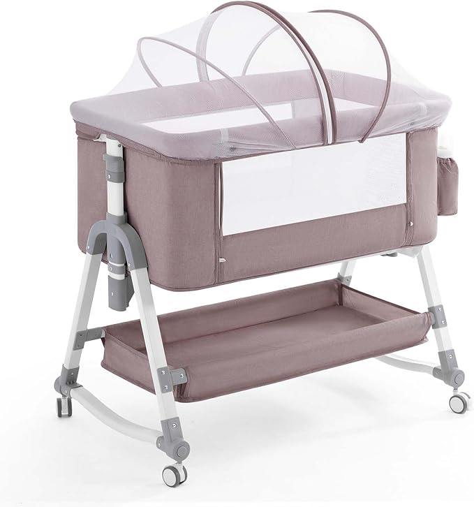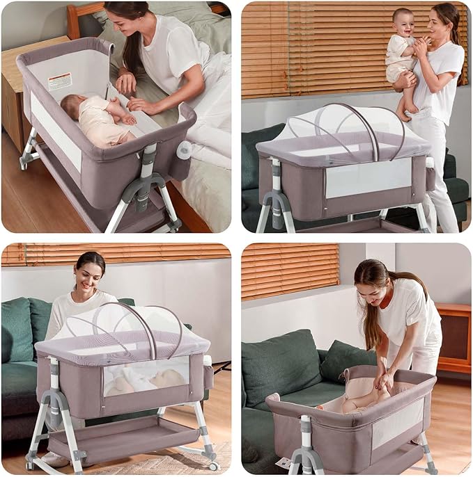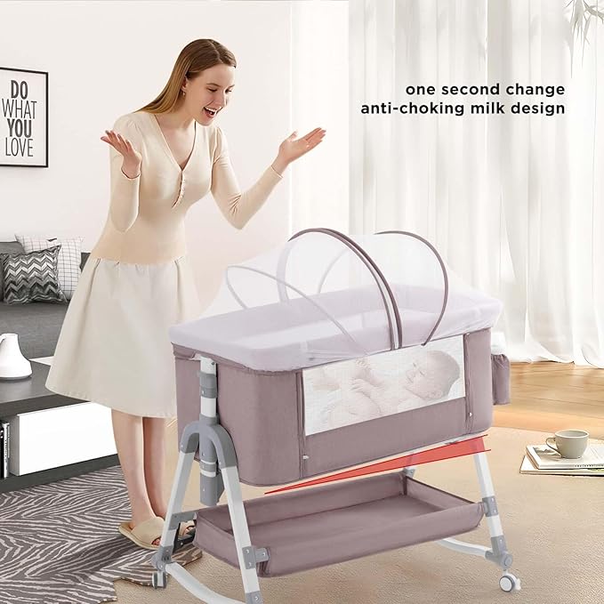 4 in 1 Baby Bassinet, Rocking Bassinets Bedside Sleeper with Comfy Mattress and Wheels, Height Adjustable Easy Folding Portable Bedside Crib for Newborn Infant,Khaki