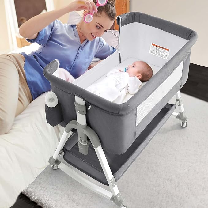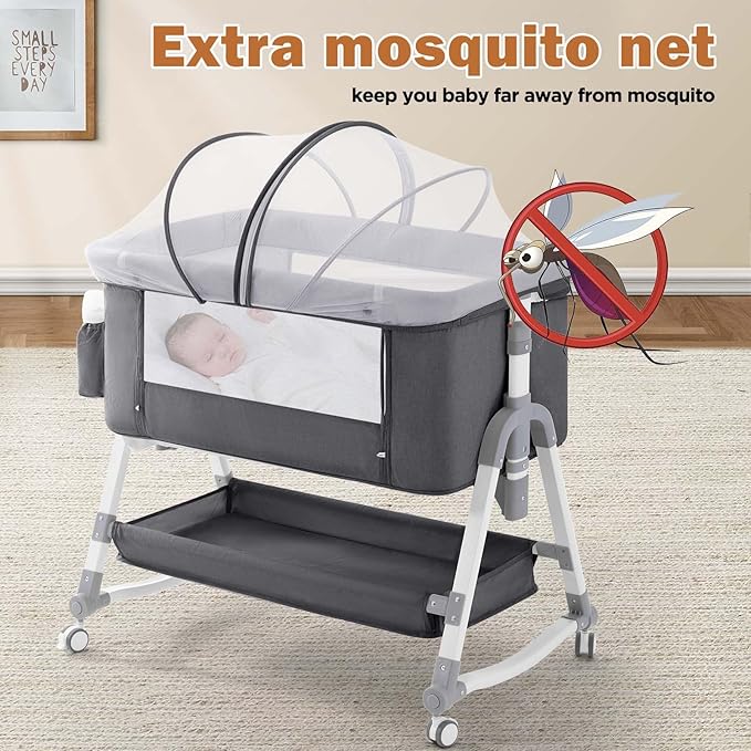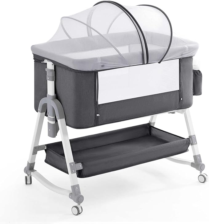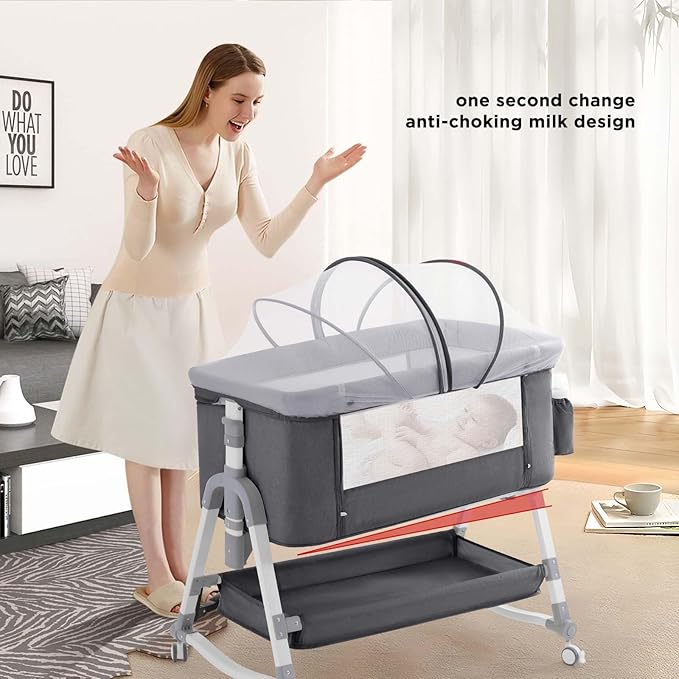 4 in 1 Baby Bassinet, Rocking Bassinets Bedside Sleeper with Comfy Mattress and Wheels, Height Adjustable Easy Folding Portable Bedside Crib for Newborn Infant,Dark Gray