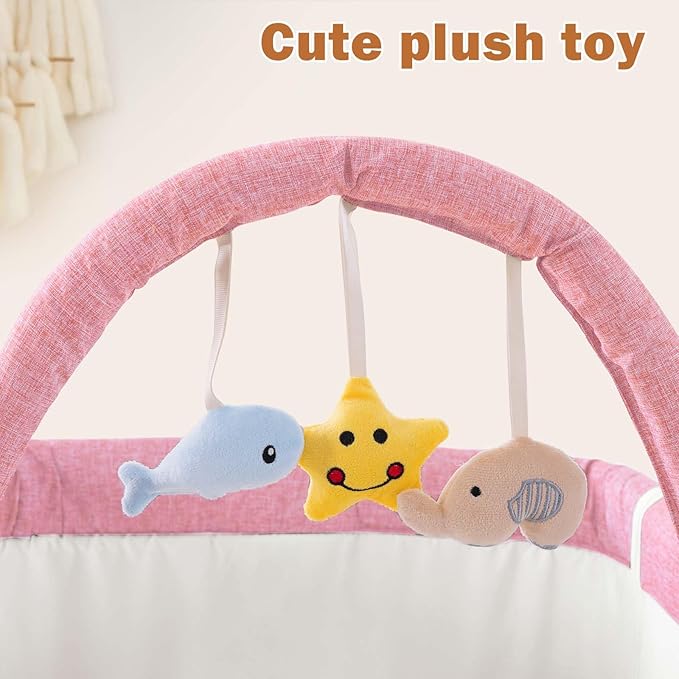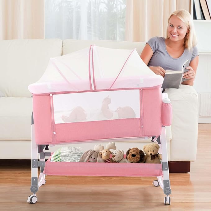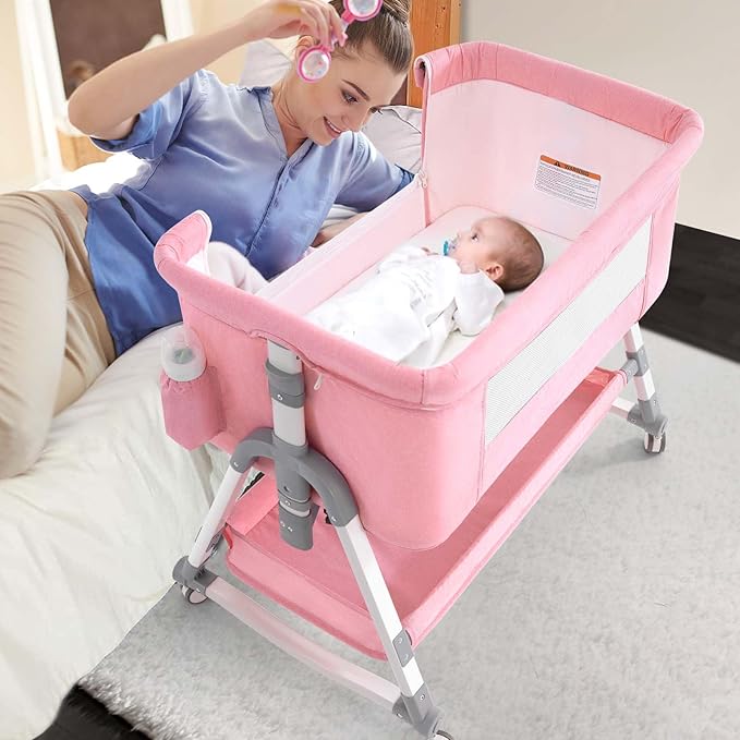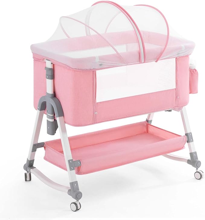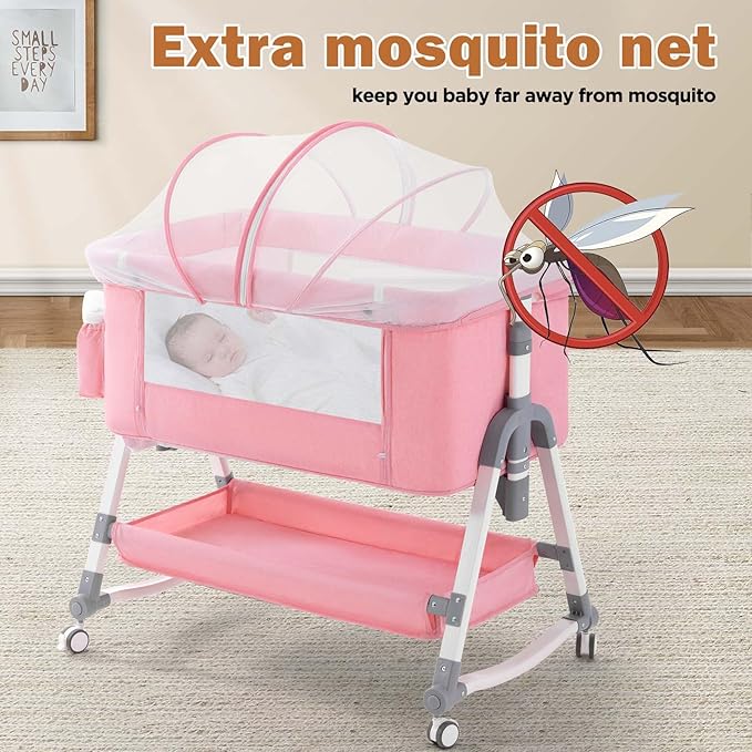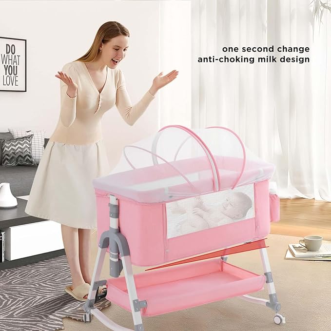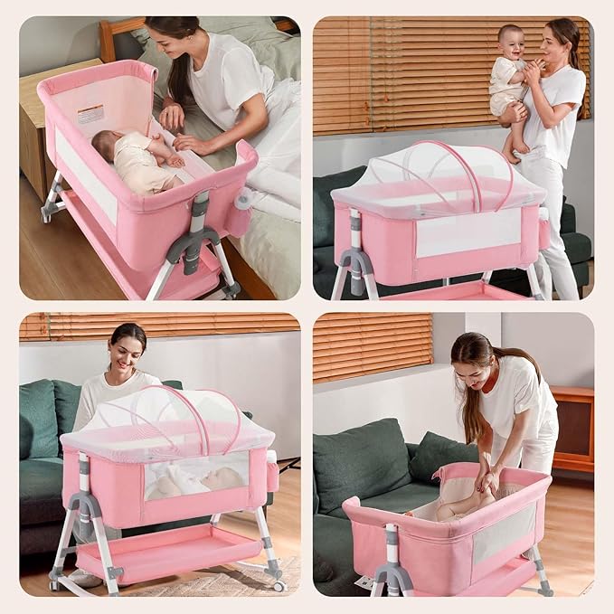 4 in 1 Baby Bassinet, Rocking Bassinets Bedside Sleeper with Comfy Mattress and Wheels, Height Adjustable Easy Folding Portable Bedside Crib for Newborn Infant,Pink