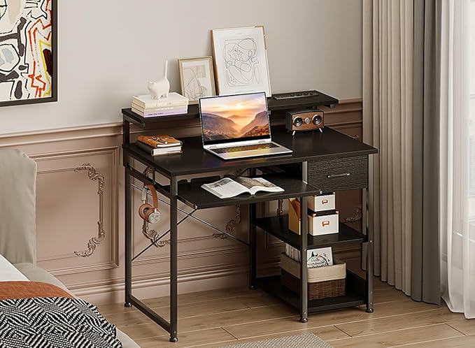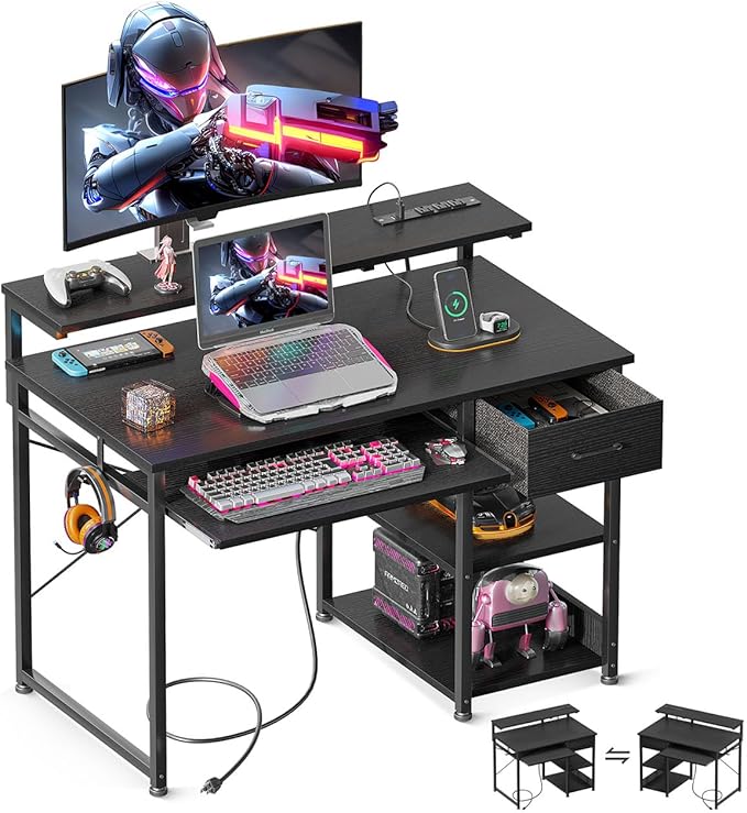 AODK Small Computer Desk with Keyboard Tray, 40 Inch Gaming Desk with Power Outlet, Office Desk with Drawer, Reversible Desk with Adjustable Monitor Shelf and Storage Shelf for Home, Black
