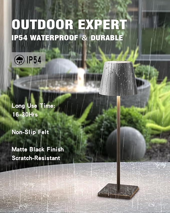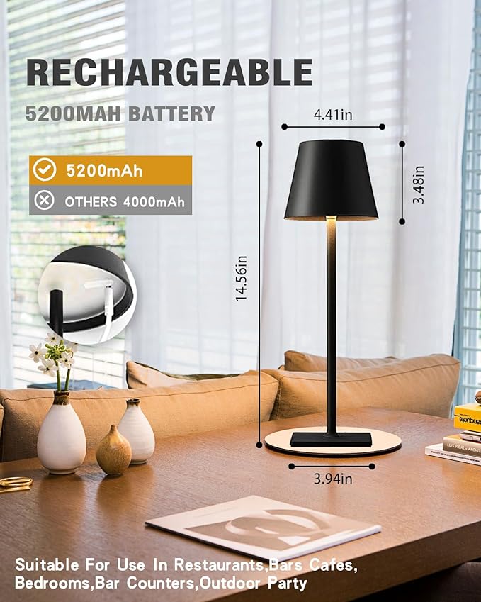 Cordless Table lamp, 5200mAh Battery Operated Lamp,3 Color Stepless Dimming Desk Lamp, IP54 Waterproof Outdoor Table Lamps for Restaurant/Bedroom/Bars/Party/Camping/Cafe Night Light (Black-1)