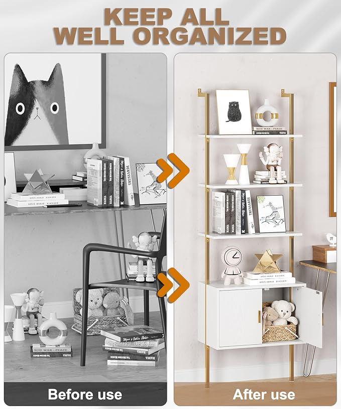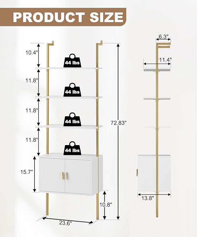 About This 【MULTIFUNCTIONAL DESIGN】This 5-tier wall mount ladder shelf bookcase with convenient storage cabinet is a multifunctional piece of furniture...